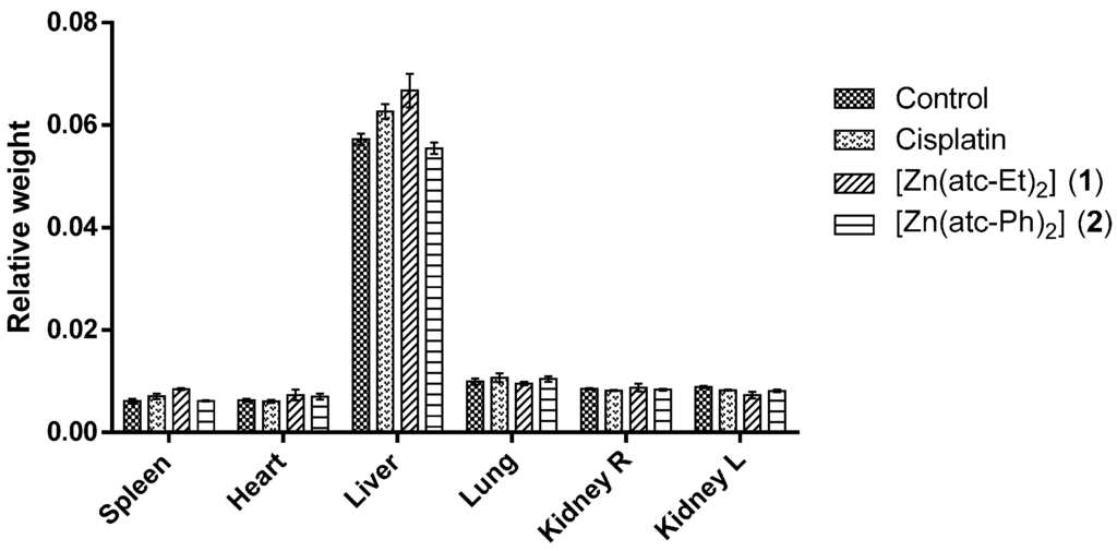 Macroscopic analysis of the organs showed no morphological changes and revealed no statistically significant difference in the mean ratio of organ weight to body weight among the animals treated with either of the ZnII complexes or cisplatin compared to the control animals (Figure 4).