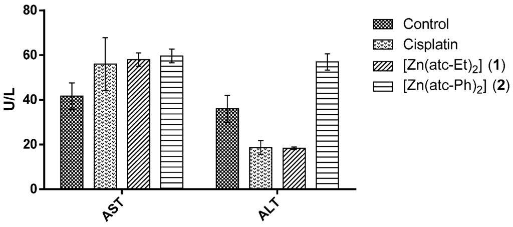 As shown in Figure 5, the levels of ALT in the samples from mice treated with cisplatin or complex 1 were the half of the control levels. However, analysis of variance (ANOVA) and Dunnett’s test did not indicate that these differences were significant (p > 0.05).