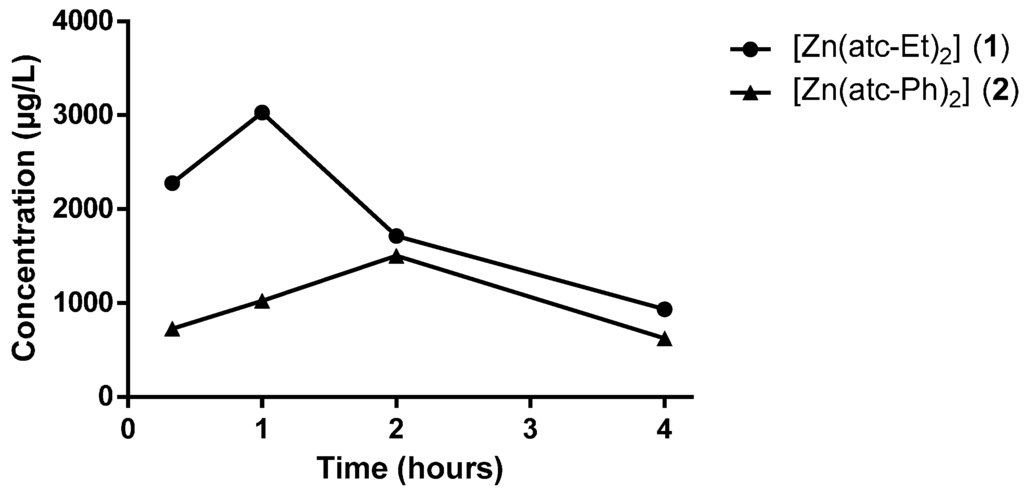 The time-concentration profiles of both complexes are in agreement with the findings of a previous study [32]. The differences in the profiles of ZnII complexes 1 and 2 observed in this study are probably due to their structural differences regarding the composition of their ligands.
