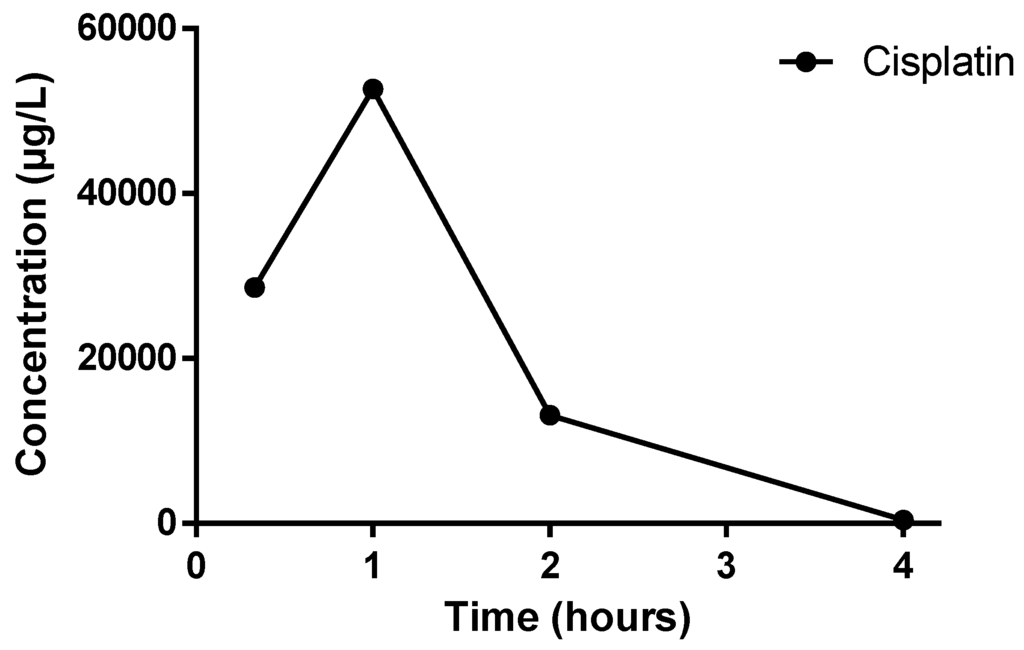Time-concentration profile of cisplatin in plasma after a single administration via oral gavage at a dose of 300 mg/Kg body weight.