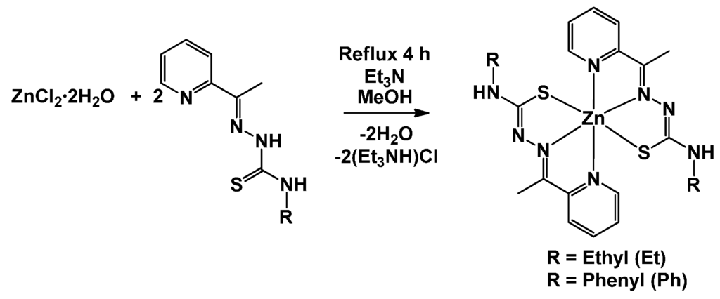 2-Acetylpyridine, 4-ethyl-3-thiosemicarbazide, 4-phenyl-3-thiosemicarbazide, ZnCl2·2H2O and solvents were obtained commercially and used without further purification. The ligands Hatc-Et and Hatc-Ph were prepared as reported [17,18]. FTIR spectra between 400 and 4000 cm−1 were measured via the Potassium Bromide (KBr) pellet method using a Shimadzu IR Prestige-21 spectrophotometer (Shimadzu®, Tsukinowa, Otsu, Japan). Elemental analyses were performed using a Perkin-Elmer CHN 2400 elemental analyzer (Perkin Elmer®, Waltham, MA, USA). The conductivities of the complexes were measured in CH2Cl2 solution using an Orion Star Series conductometer (Thermo Scientific®, San Diego, CA, USA). Ultraviolet-visible (UV-Vis) spectra of solutions diluted in DMSO were measured using a Shimadzu UV-1800 spectrophotometer (Shimadzu®, Tsukinowa, Otsu, Japan). Proton nuclear magnetic resonance (1H NMR) spectra were acquired using an Agilent 400/54 Premium Shielded 9.4 T NMR spectrometer (Agilent®, Santa Clara, CA, USA), set to 399.8 MHz for 1H. The NMR spectra were internally referenced to the spectrum of Tetramethylsilane (TMS). Yellow crystals were produced via slow evaporation of the mother solution of the two ZnII complexes at room temperature. Data collection was performed at 296 K by applying Mo-Kα radiation (λ = 71.073 pm) using a Bruker Kappa APEX II Duo diffractometer (Bruker®, Karlsruhe, Germany). The multi-scan method was applied for absorption correction. The structures were solved with SHELXS97 software (Gottingen, Germany) [33] using direct methods, and all non-hydrogen atoms were refined with anisotropic displacement parameters in SHELXL97. The hydrogen atoms were calculated at idealized positions using the riding model option of SHELXL97 [33]. The asymmetric unit in the crystal structure of complex 2 contains only half of the entire molecule. Table 4 presents more detailed information about the structure determinations. The structural data were deposited at The Cambridge Crystallographic Data Centre (CCDC) as entries CCDC 1436883 (1) and CCDC1436884 (2), and these data can be obtained free of charge from The Cambridge Crystallographic Data Centre.
