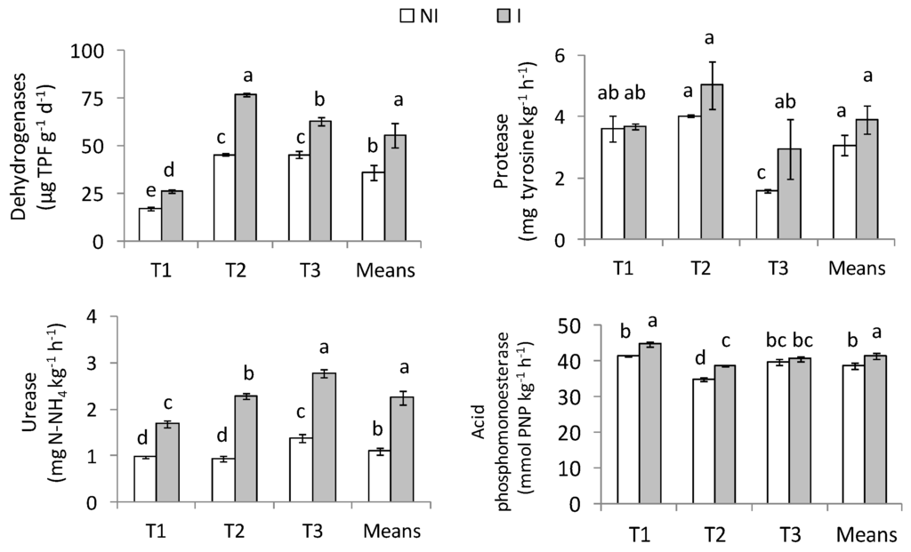 Enzymatic activity. Different lowercase letters indicate significant differences (p < 0.05). NI, non-inoculated; I, inoculated with Rhizobium; T1, 5–6 leaf stage; T2, flowering; T3, pod formation stage.