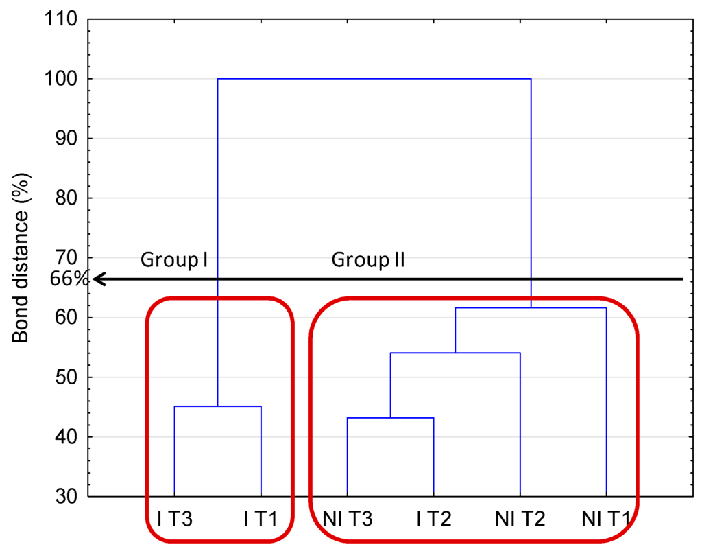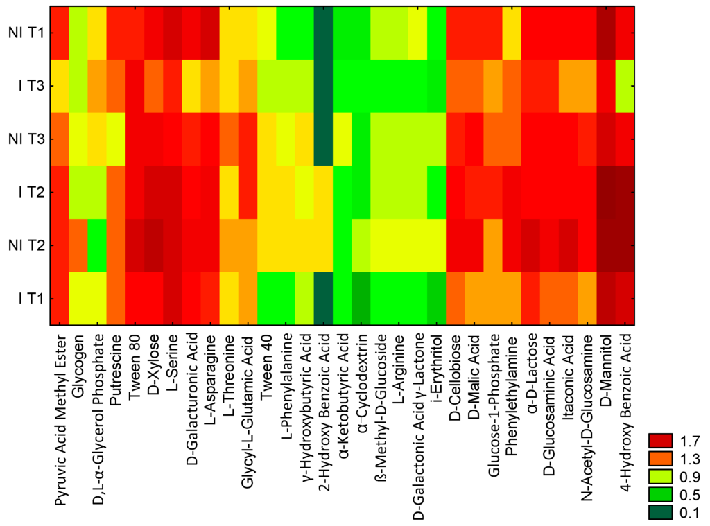 Figure 2 presents the bond distances between the treatments, where clustering was evaluated using the carbon utilization patterns of the substrates. Taking into consideration Sneath’s criterion 66%, two groups were distinguished. A similar response was noted under I T3 and I T1 (group 1) in terms of carbon substrate utilization. These findings were supported by the carbon substrate utilization intensity (Figure 3). A lower degree of substrate utilization was observed in group 1 than 2. The lower rate of utilization of substrates by group 1 than 2 was found for N-Acetyl-d-Glucosamine, d-Galactonic Acid γ-Lactone, l-Asparagine, d-Cellobiose, α-d-Lactose, d-Malic Acid, l-Arginine, β-Methyl-d-Glucoside, and Itaconic Acid. Significant differences among the treatments were observed in the utilization patterns of categorized substrates (Figure 4). The highest differences between the NI and I treatment were noted for polymers in T2 and carboxylic acids in T3 when both categorized substrates were used to a lesser extent under I than NI.