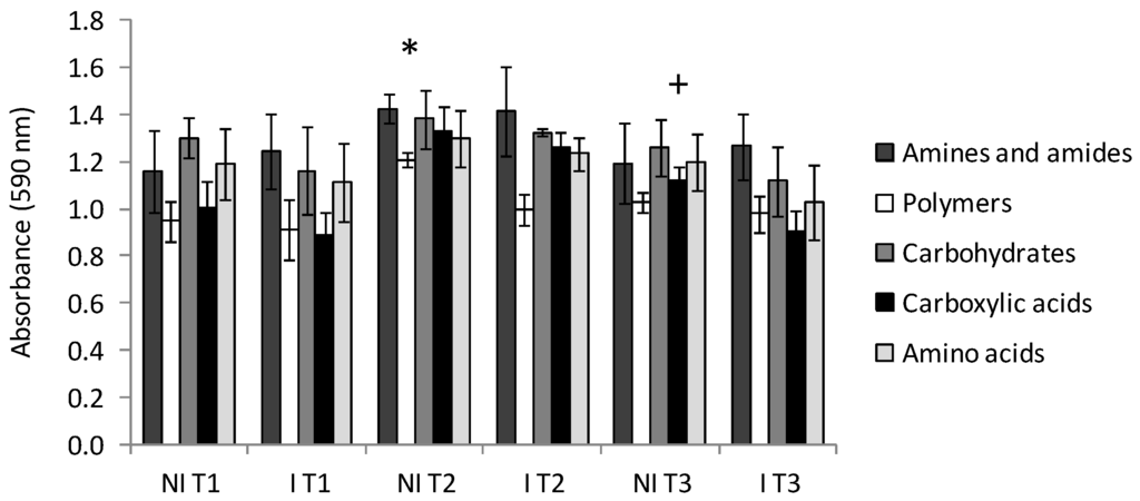 Utilization of categorized substrate by the microbial communities. Errors bars indicate the standard deviations of the mean; * indicates significant difference in polymers utilization between NI T2 and I T2; and + indicates difference in carboxylic acids utilization between NI T3 and I T3 (p < 0.05); n = 3. NI, non-inoculated; I, inoculated with Rhizobium; T1, 5–6 leaf stage; T2, flowering; T3, pod formation stage.