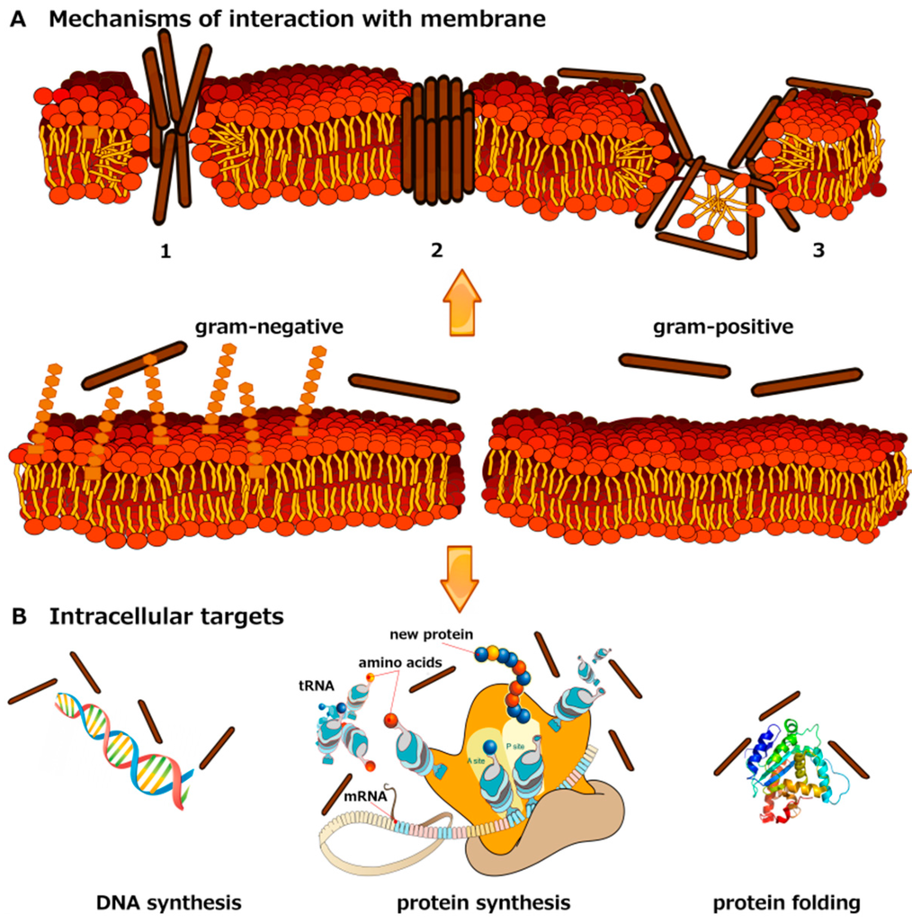 Mechanisms inducing the damage of the membrane and/or internalization (panel A); The main proposed mode of action are: carpet model (1); barrel stave model (2) and toroidal-pore model (3). Alternative mechanisms of antibacterial activity involving intracellular targets (panel B). Some AMPs act on intracellular targets inhibiting cell-wall synthesis, nucleic acid binding and synthesis, protein production, and enzyme activity.