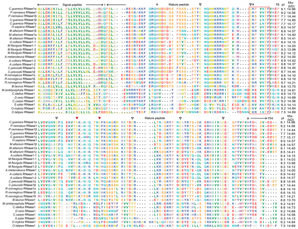 Multiple protein sequences alignment of RNase1 in fishes and mammals. Dashes indicate alignment gaps. Yellow underlines showed the signal peptides. The putative isoelectric point (pI) and molecular weight (Mw) indicated the isoelectric point and molecular weight (kDa) of the mature peptide, respectively. The conversed CKXXNTF motif is shown in a box. The eight structural cysteines (active-site residues) are marked with triangles and the two red triangles indicated alteration in fishes. Asterisks show the three catalytic resides.