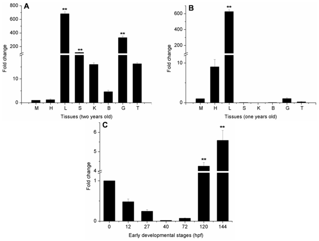 The expression patterns of RNase1 genes in different developmental stages and tissues of M. amblycephala. B-actin was used as reference gene. (A) Two-year-old fish (the muscle tissue was the same as in the control); (B) One-year-old fish (the muscle tissue was the same as in the control); (C) early different developmental stages of M. amblycephala (0 hpf egg was the same as in the control). cDNAs were used for PCR from total RNA samples obtained from the heart (H), liver (L), spleen (S), kidney (K), brain (B), muscle (M), gut (G) and testis (T) of one year and two-year-old fish, 0 (fertilized egg), 12 (late gastrula stage), 27 (heart appearance), 40 (hatching), 72 (gill circulation), 120 (air bladder formation), 144 (intestine appearance) hours post-fertilization (hpf) embryos/larvae. Differences were determined by one-way analysis of variance (ANOVA). Statistically significant differences from the control group are marked as ** p <0.01.