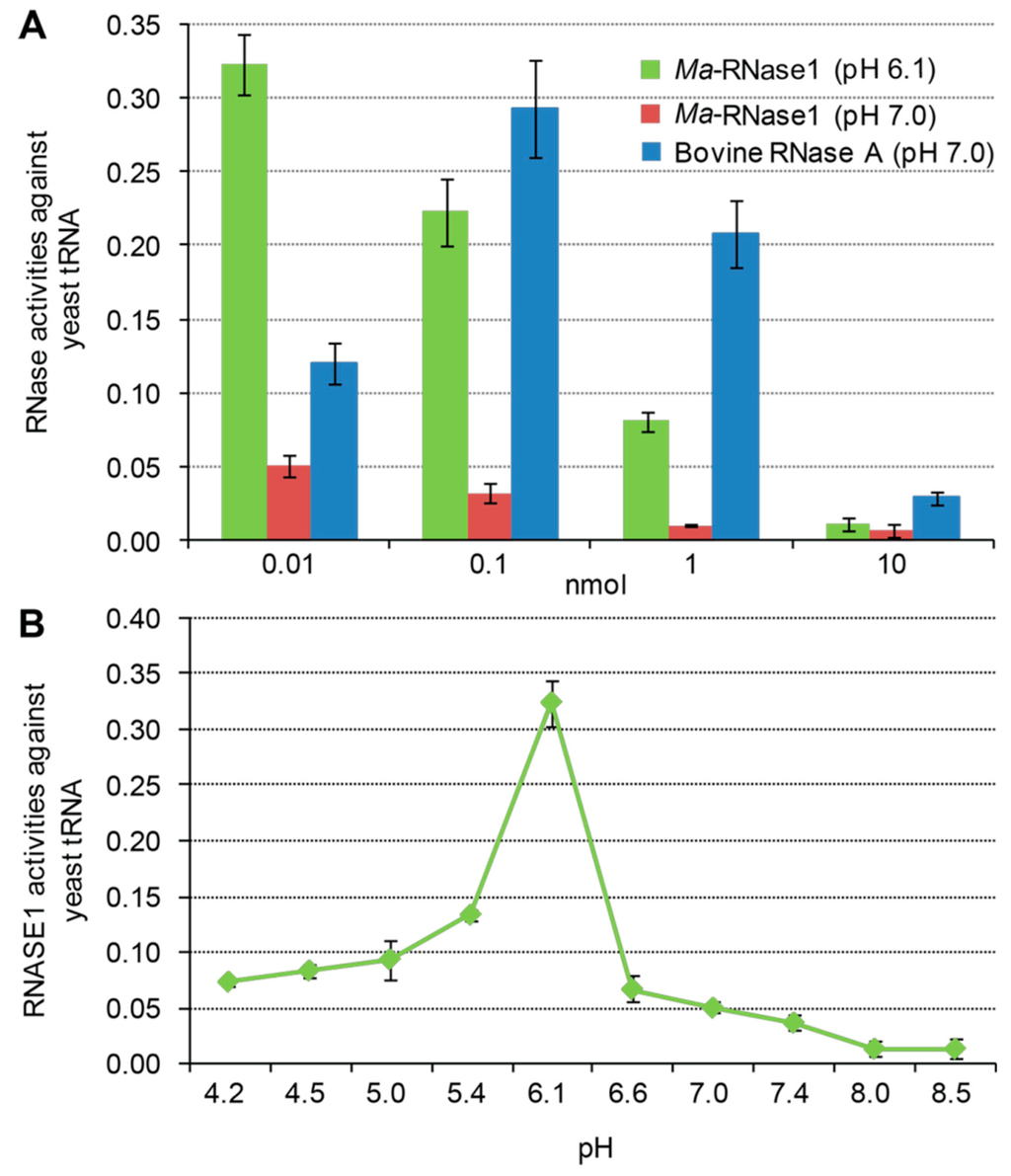 Ribonucleolytic activities of M. amblycephala recombinant protein RNase1. Comparison the ribonucleolytic activities of Ma-RNase1 and bovine RNase A at different amounts (A); RNase activity against yeast tRNA at different pH levels (B).