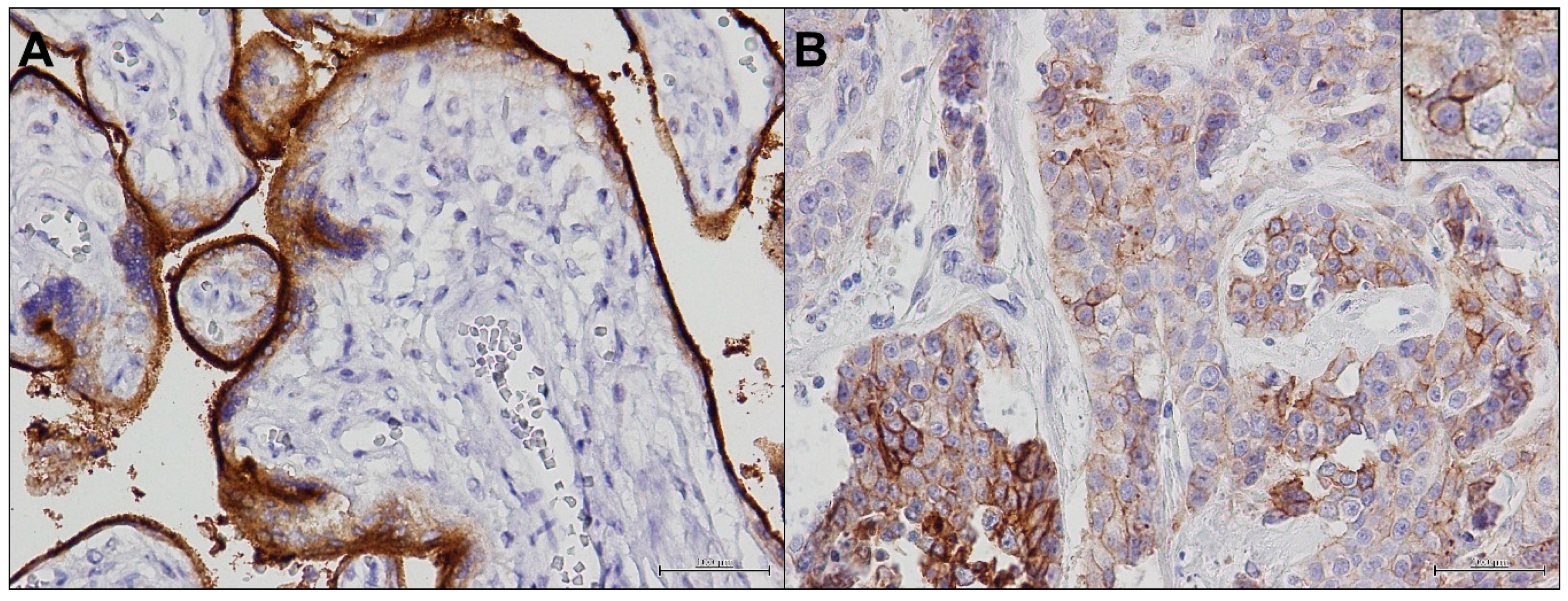 PD-L1 (programmed death ligand 1) staining: (A) Anti-PD-L1 (SP-142) clone in placenta sample (40×); and (B) Anti-PD-L1 (SP-142) clone in tumor sample (40×) with a detail of cell membrane positivity (60×).