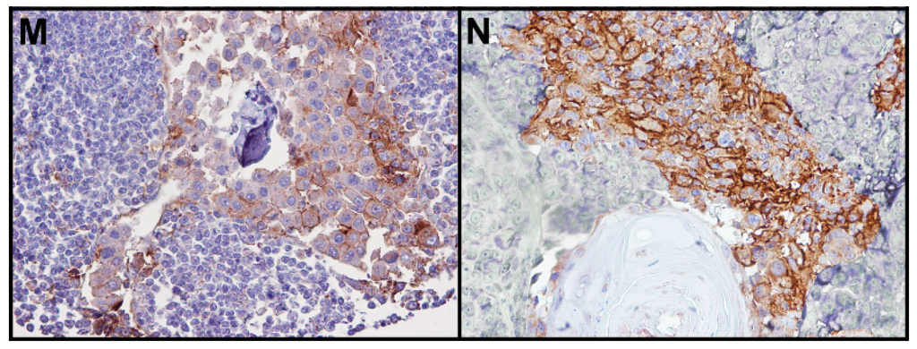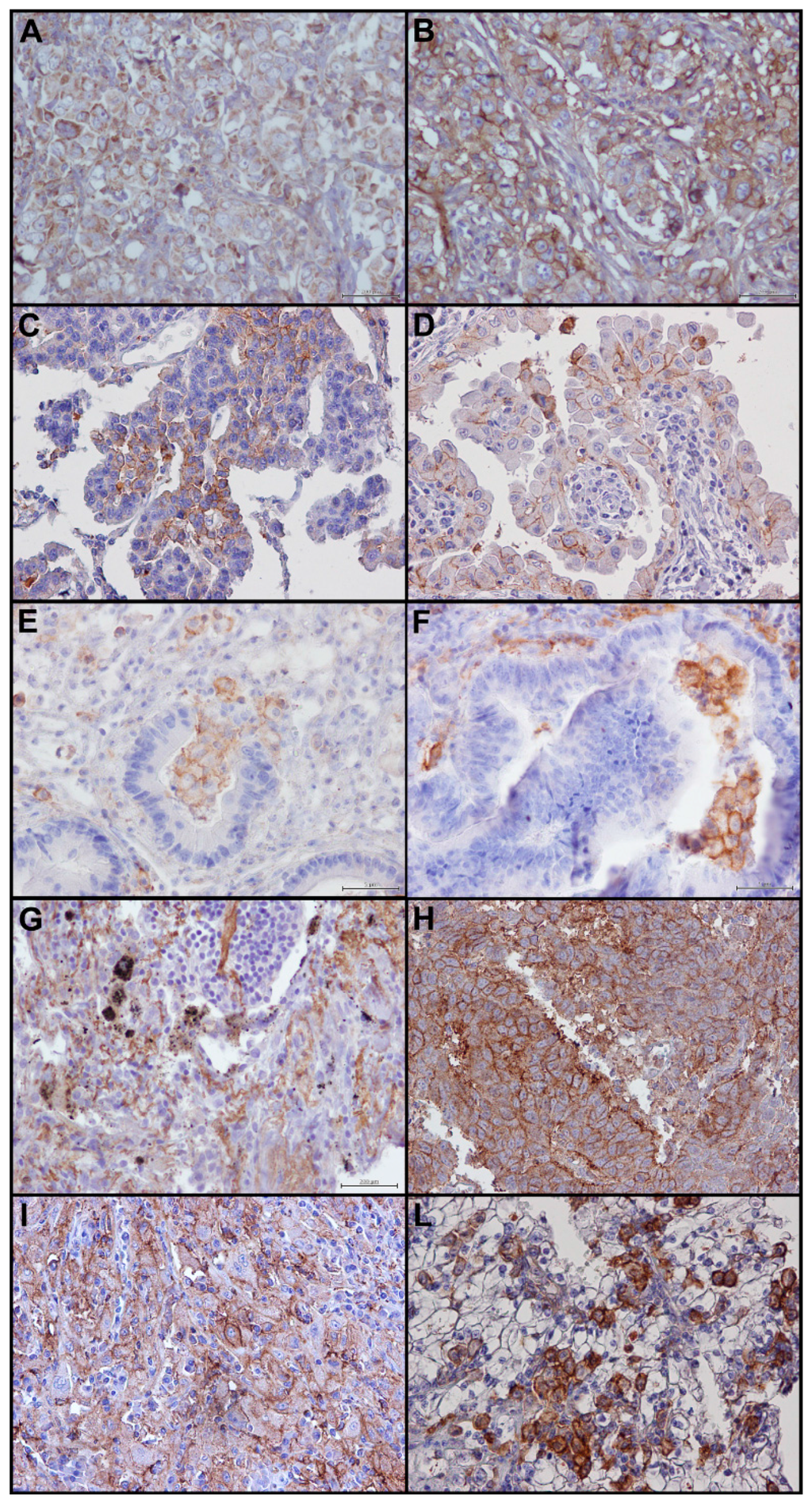 PD-L1 staining in epithelial tumors: (A) incomplete immunoreactivity of membrane in breast cancer sample (40×); (B) complete immunoreactivity of membrane in breast cancer sample (40×); (C) incomplete immunoreactivity of membrane in ovarian cancer sample without cytoplasmic staining (40×); (D) incomplete immunoreactivity of membrane in thyroid cancer sample with mild cytoplasmic staining (40×); (E) incomplete immunoreactivity of membrane in colon cancer sample (40×); (F) complete immunoreactivity of membrane in colon cancer sample (40×); (G) incomplete immunoreactivity of membrane with mild cytoplasmic staining in lung cancer sample (40×); (H) complete immunoreactivity of membrane with mild cytoplasmic staining in lung cancer sample (40×); (I) incomplete immunoreactivity of membrane without cytoplasmic staining in kidney cancer sample (40×); (L) complete immunoreactivity of membrane with cytoplasmic staining in kidney cancer sample (40×); (M) incomplete immunoreactivity of membrane in melanoma sample (40×); and (N) complete immunoreactivity of membrane in melanoma sample (40×).