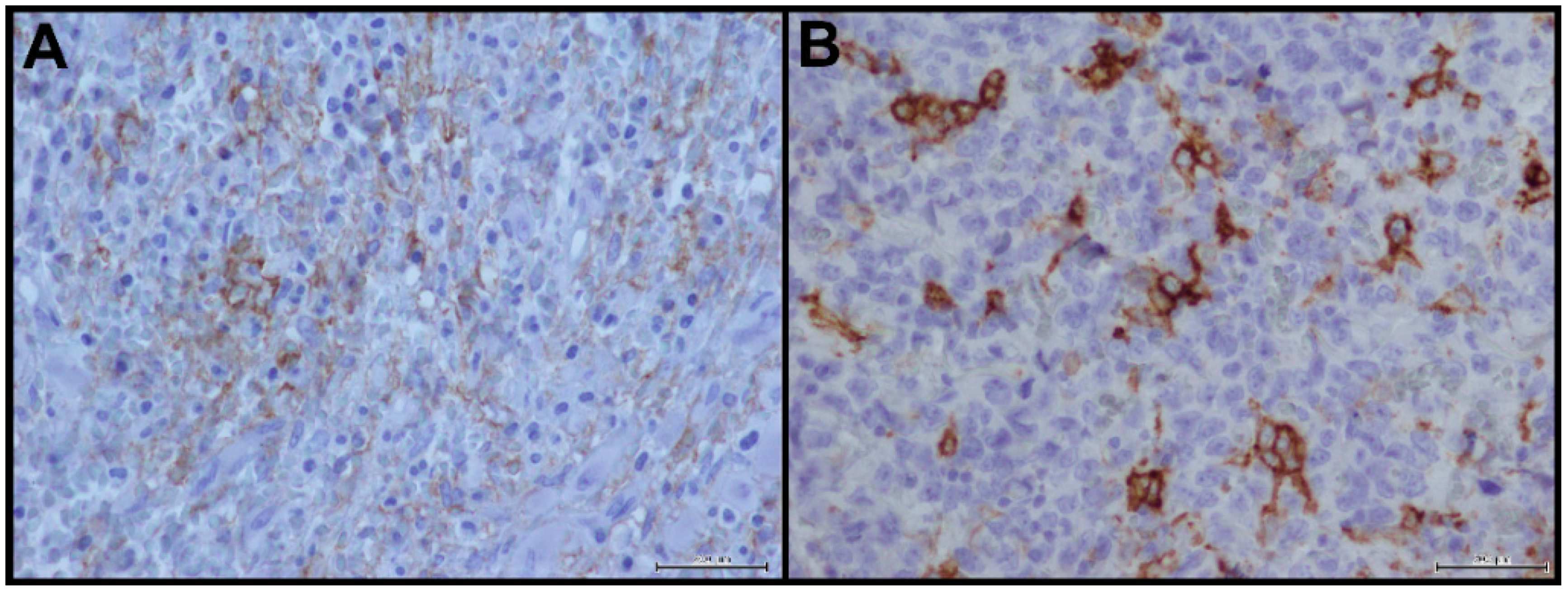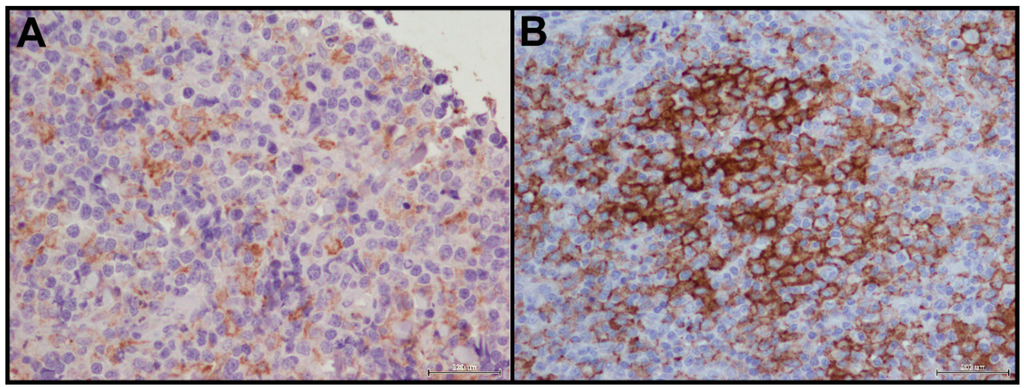 Selected non-Hodgkin lymphoma samples showed a consistent expression of PD-L1 in 60%–70% of tumor samples with a clear incomplete (Figure 4A) and complete (Figure 4B) immunoreactivity of membrane in ≥10% of tumor cells.