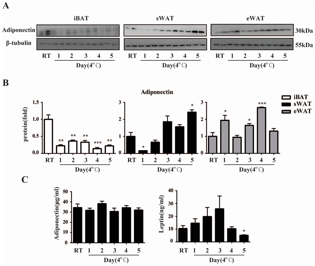 2.3. Cold Exposure Changes Adiponectin and Leptin Protein Levels in Adipose Tissues