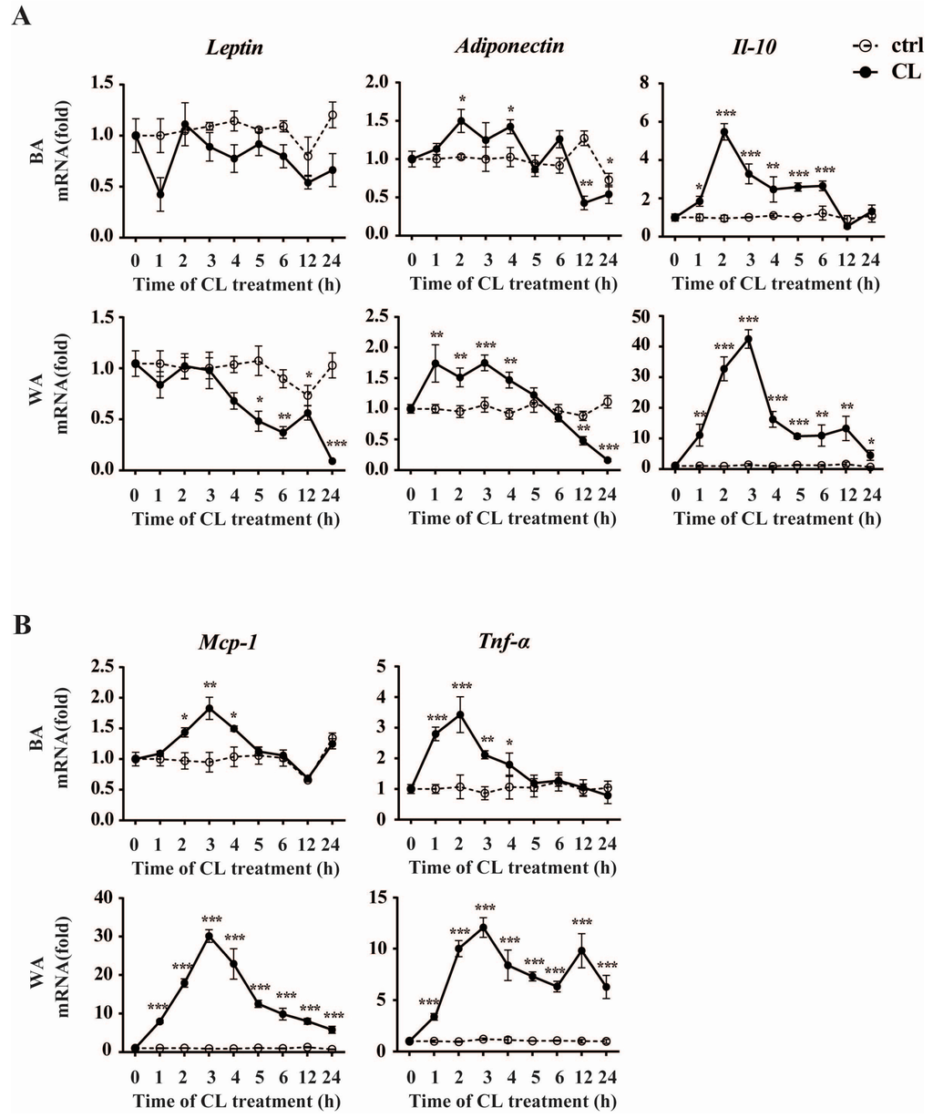 Chicago/Turabian StyleLuo, Xiao, Ru Jia, Qiangling Zhang, Bo Sun, and Jianqun Yan. 2016. "Cold-Induced Browning Dynamically Alters the Expression Profiles of Inflammatory Adipokines with Tissue Specificity in Mice" International Journal of Molecular Sciences 17, no. 5: 795. https://doi.org/10.3390/ijms17050795