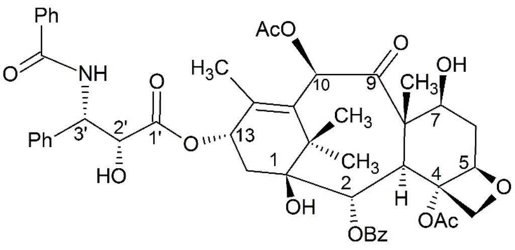 Paclitaxel (Figure 1) was isolated from Taxus brevifolia and its anticancer activity first reported in 1971 []. Additionally, it was approved as a kind of microtubule stabilizing agent in 1992. As an anticancer drug, paclitaxel can promote tubulin polymerization and stabilize microtubules from depolymerizing []. These procedures are relevant to special regions on tubulin including H6–H7 and the M-loop []. Paclitaxel is also able to interact with tubulin assemblages at low temperatures, as well as without GTP or microtubule-associated proteins []. The binding affinity of paclitaxel and tubulin depends on the nucleotide content of tubulin []. Due to this unique anticancer mechanism, paclitaxel has aroused much interest for further development. Besides its anticancer activity, paclitaxel can exert a variety of positive influences on the immune system [], and play a potential role in treating neurodegenerative diseases as well as inhibiting botulinum neurotoxin [,].