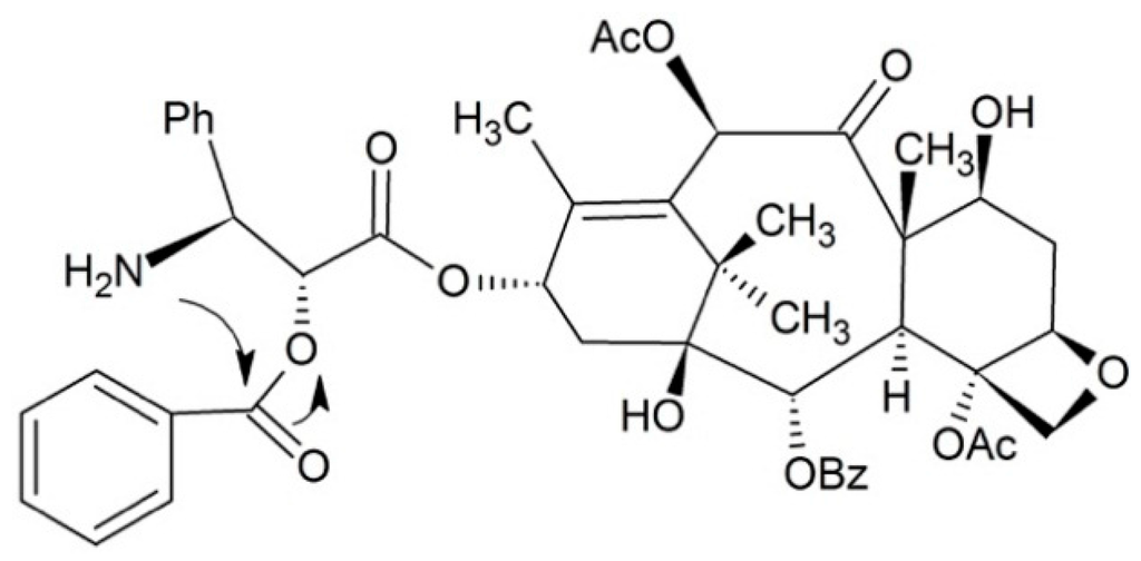 - Chen, S.-H.; Farina, V.; Vyas, D.M.; Doyle, T.W.; Long, B.H.; Fairchild, C. Synthesis and biological evaluation of C-13 amide-linked paclitaxel (Taxol) analogs. J. Org. Chem. 1996, 61, 2065–2070. [Google Scholar] [CrossRef]