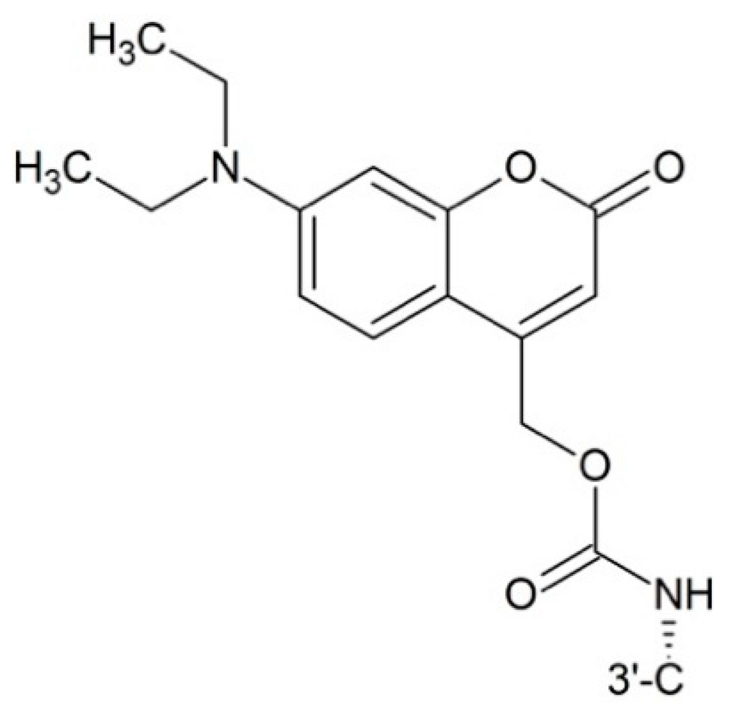 Photodynamic therapy (PDT) is a type of method for treating cancer. After a sensitizer is administered, the pathological area is exposed to visible light. The beam of light can activate a sensitizer to release a cytotoxic free radical or singlet oxygen. Skwarczynski and co-workers [] first synthesized photo responsive paclitaxel by introducing 7-N,N-diethylamino-4-hydroxymethyl coumarin (DECM) as a photolabile group to 2′-benzoyl-paclitaxel which could increase paclitaxel’s water solubility by transforming it into chloride and be activated at 430.6 nm without decomposition (Figure 8). After activation by light, the cleavage of the carbamate induces O–N acyl migration to end up with paclitaxel. Noguchi and co-workers [] also synthesized a coumarin-based high water soluble paclitaxel prodrug, which could release the parent drug at 365 nm UV light.