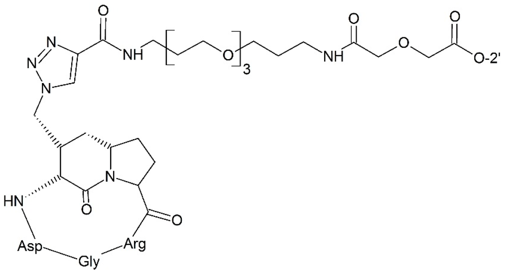 - Colombo, R.; Mingozzi, M.; Belvisi, L.; Arosio, D.; Carenini, N.; Perego, P.; Zaffaroni, N.; Cesare, D.; Castiglioni, V.; Scanziani, E.; et al. Synthesis and biological evaluation (in vitro and in vivo) of cyclic RGD peptidomimetic—Paclitaxel conjugates targeting integrin αVβ3. J. Med. Chem. 2012, 55, 10460–10474. [Google Scholar] [CrossRef] [PubMed]