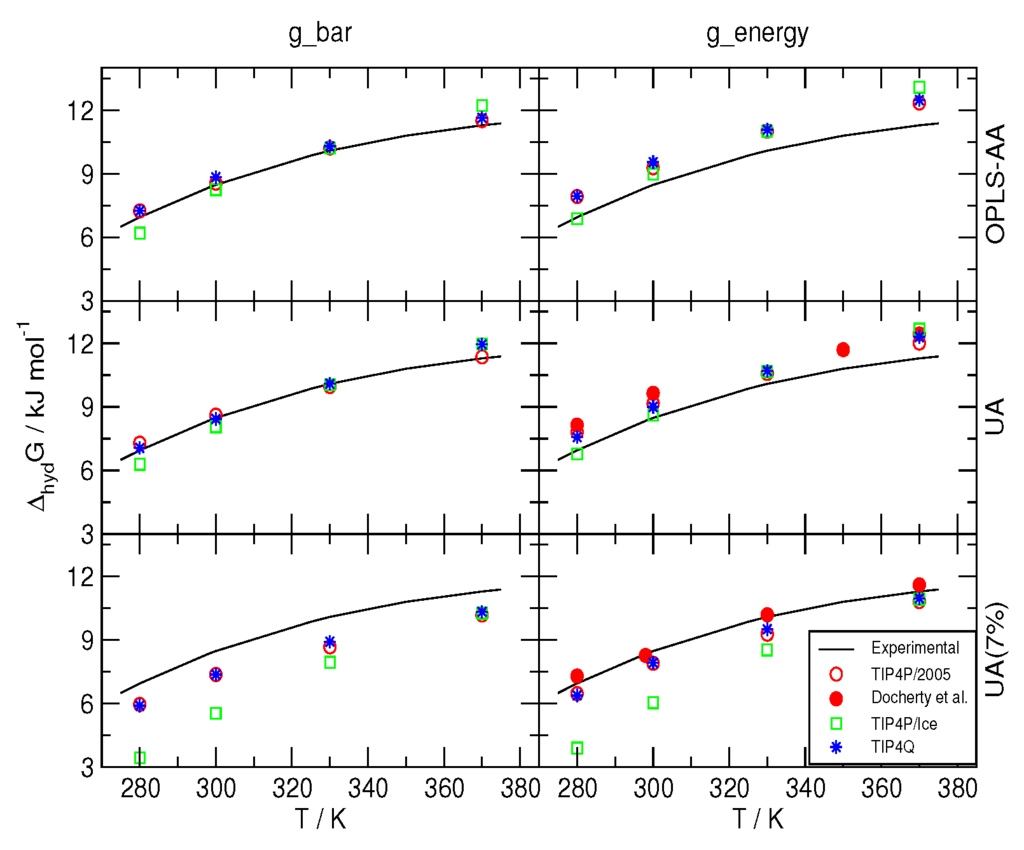 The GROMACS 4.5.1 package [55,56,57,58] was used for MD simulations to compute the hydration free energy of methane with the thermodynamic integration method [46,59,60,61,62] built in it. A system with one methane molecule in 241 water molecules was simulated under constant pressure and temperature (NpT ensemble), at 1 bar, controlled with the Berendsen barostat and at temperatures of 280, 300, 330 and 370 K, controlled by using the stochastic dynamics (sd) integrator with a 2-fs time-step, as described in the GROMACS user manual [63] (for the thermodynamic integration and BAR [46] methods, see Section 3.12.2 in user manual).