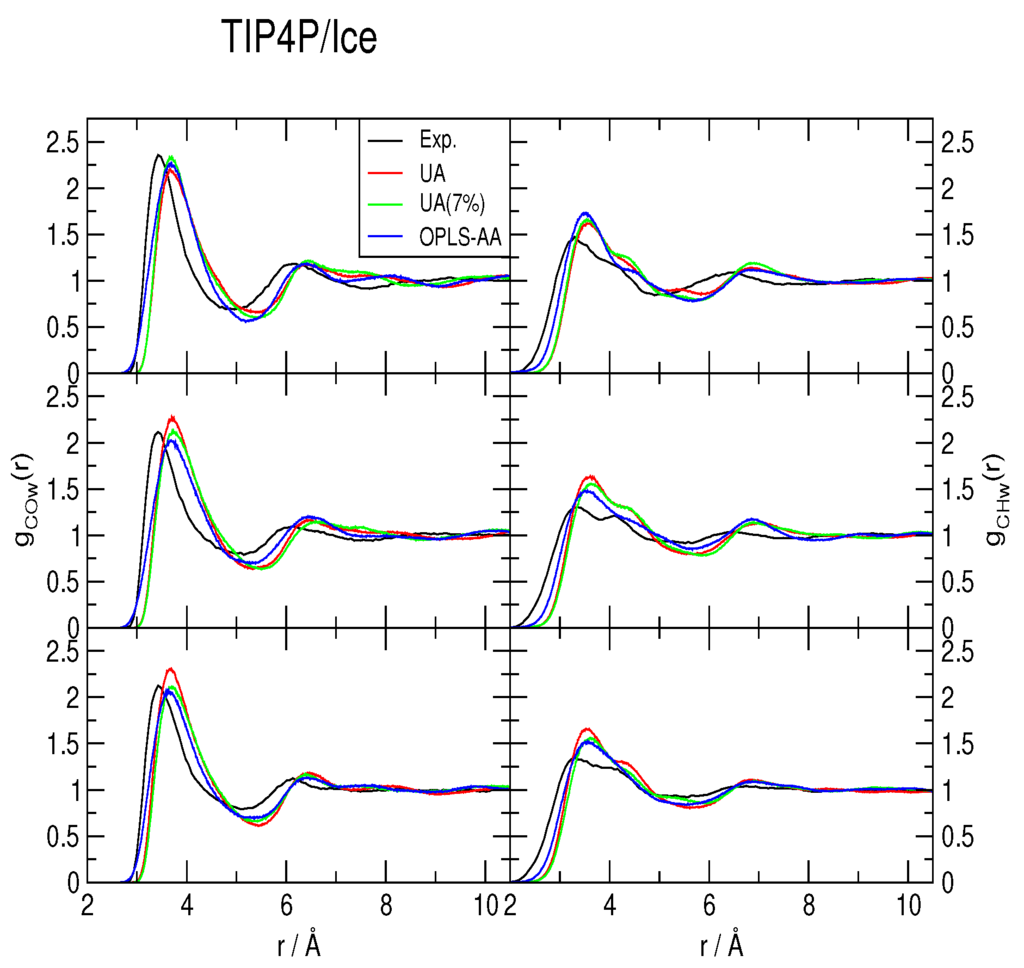 Comparison to the experimentally determined [34] methane-water radial distribution functions of those obtained from simulations with the TIP4P/Ice water model at 277 K (top), 283 K (middle) and 291 K (bottom), all under a pressure of 145 bar. UA: United-atom model from Reference [41]; UA (7%): Same model with a 7% correction for the C−O interaction; OPLS-AA: All-atom force-field from Reference [40].
