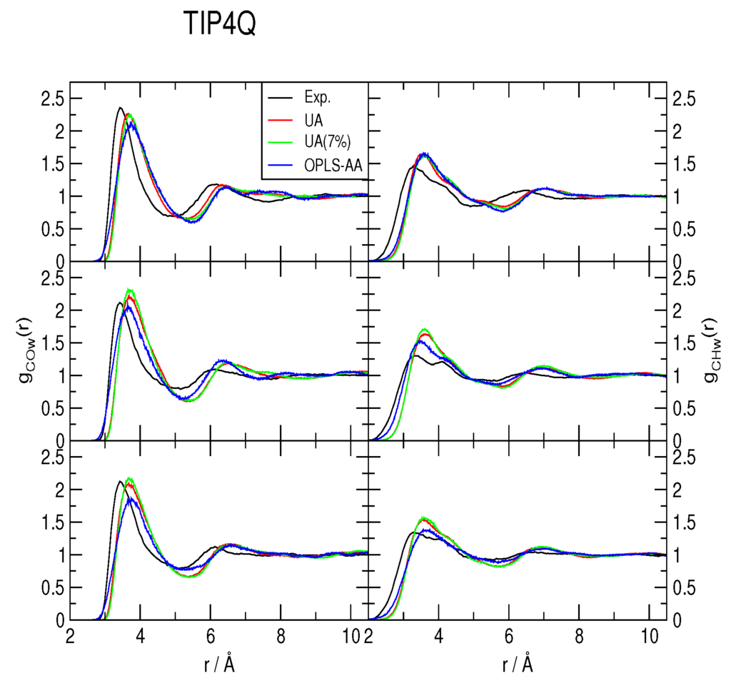 The methane-water rdfs gCOw(r) and gCHw(r) are shown in Figure 2, Figure 3 and Figure 4, for the TIP4P/2005, TIP4P/Ice and TIP4Q water models, respectively. All models predict a more ample cavity for methane, which is inferred from the ca. 0.25 Å shift to the right of the first peak in both rdfs. In general, the OPLS-AA produced less structure than the UA model. While the 7% correction to ϵC,O flattened the rdfs when used with both TIP4P/2005 and TIP4P/Ice, it had a much smaller (and opposite) effect with TIP4Q. In fact, it can be noticed in Figure 4 that TIP4Q is less sensitive to the choice of CH4 model.