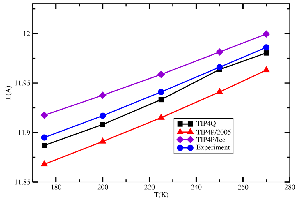 The behavior of the unit cell length of the sI hydrate as a function of temperature that resulted from the simulations described in Section 3 is depicted in Figure 5, and the numerical values are presented in Table 2. It can be seen that the TIP4Q gives the best agreement with the experimental values, whereas TIP4P/2005 has the correct trend, but slightly underestimated in some 0.03 Å. On the other hand, the TIP4P/Ice overestimated the experimental values in some 0.02 Å.