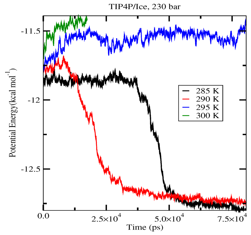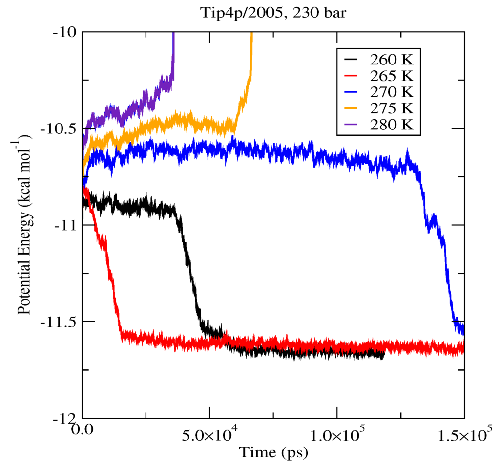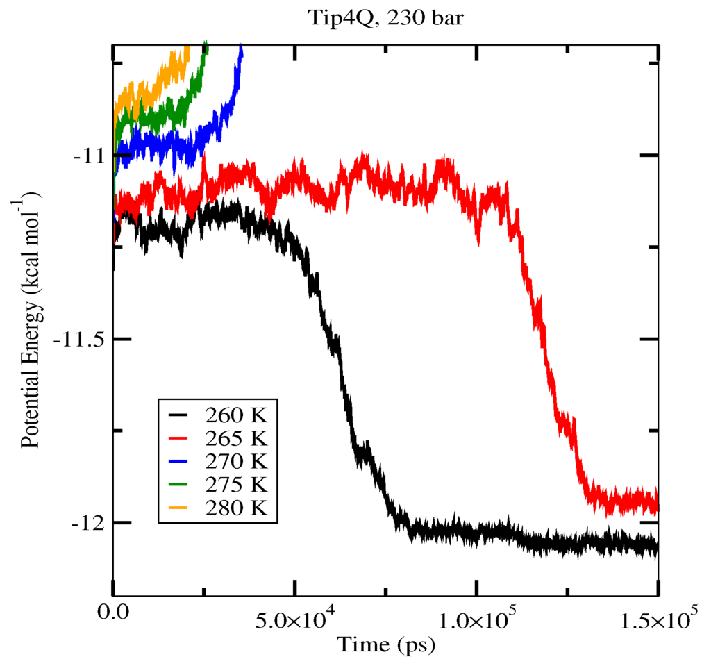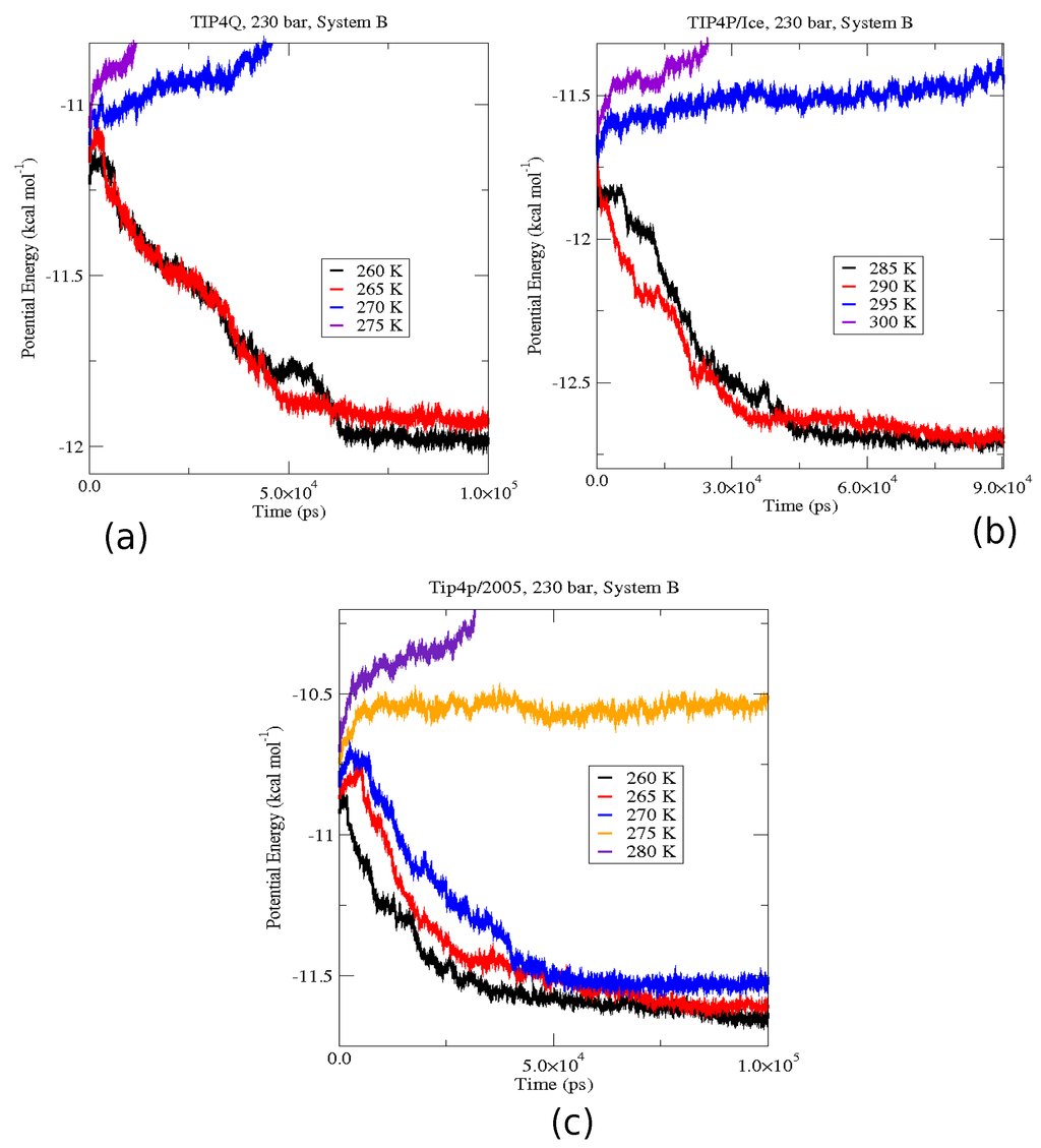 The first set of simulations was made at 230 bar, and the evolution in time of the potential energy at various different temperatures is shown in Figure 6 for TIP4P/2005; in Figure 7, for TIP4P/Ice, and in Figure 8, for TIP4Q, all with System A. In Figure 9, we show the results for the three models, all with System B. The resulting three-phase coexistence temperatures, T3, are presented in Table 3 and in Figure 10; a good agreement was found with the data in [42,44] for the TIP4P/2005 and TIP4P/Ice models, and the value obtained for TIP4Q is close to that of TIP4P/2005. It can be seen that the three water models give the same coexistence temperature for System A and for System B at 230 bar, with the difference that System B crystallizes faster than System A with the same water potential. For example, using the TIP4Q water model, System B crystallizes in around 50,000 ps, while System A crystallizes in 150,000 ps. With the TIP4P/Ice water model, System B crystallizes in around 40,000 ps, while System A in 50,000 ps. Additionally, with the TIP4P/2005, System B crystallizes in around 40,000 ps, while System A in 150,000 ps. Opposite the findings in [52], the simulation of a larger system affected solely the rate at which crystallization occurred, but not the predicted coexistence temperature. It can be seen that both the TIP4Q and TIP4P/2005 models underestimate the experimental values of T3 for all pressures. This is more clearly seen in Figure 11, where the logarithm of the pressure has been plotted as a function of temperature. The experimental data have been taken from [1]. The TIP4P/Ice water model is the best of the three models considered in this study, in reproducing the coexistence temperature for the range of pressures studied in this work. The direct coexistence method possesses an inherent degree of stochasticity [44,53], which is why our result of the TIP4P/Ice model at 400 bar is slightly different from the results of Conde and Vega (−5 K) and Michalis et al. (+4.1 K). Additionally, for the TIP4P/2005 model at 400 bar, our result is also slightly different from the result of Conde and Vega (+1.5 K). The graphs of the simulations under pressure of 80 bar and 400 bar are not shown.