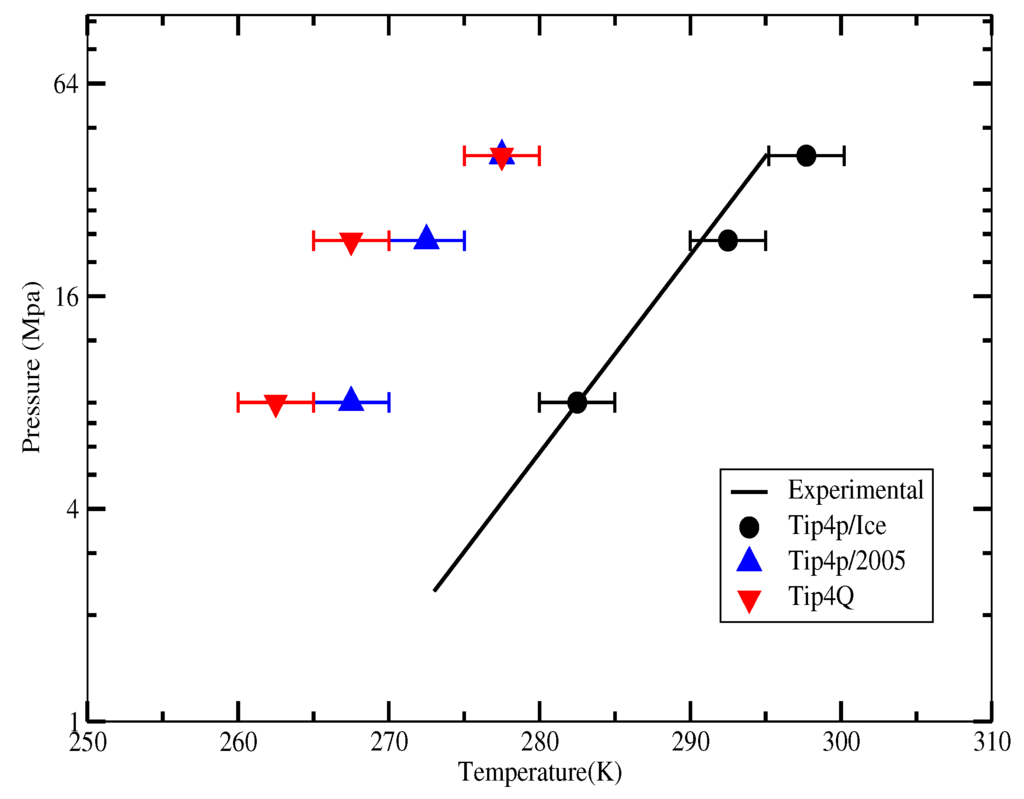 - Fernández, R.G.; Abascal, J.L.; Vega, C. The melting point of ice Ih for common water models calculated from direct coexistence of the solid-liquid interface. J. Chem. Phys. 2006, 124, 144506. [Google Scholar] [CrossRef] [PubMed]