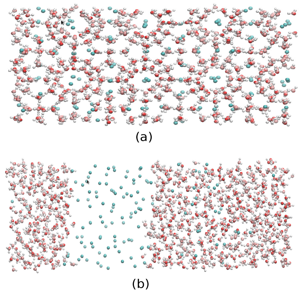 Finally, we have performed molecular dynamics simulations to estimate the three-phase (methane hydrate-water-methane) coexistence temperature T3 at three different pressures (80, 230 and 400 bar) by using the direct coexistence method and the three water models (TIP4P/Ice, TIP4Q and TIP4P/2005) with the UA model methane. The results showed that the three-phase coexistence temperatures obtained with the TIP4P/Ice model were in good agreement with the experimental data. Results obtained by TIP4P/2005 and TIP4Q models were shifted to lower temperatures by about 20 and 25 K, respectively, with respect to the experimental data. A caveat is in order, as the method used to determine the coexistence temperatures relies solely on the behavior of the potential energy, disregarding other criteria to track the formation/melting of the hydrate. To be on the safe side, the final configurations of System A at P = 230 bar and two temperatures, T = 290 K and T = 300 K, are shown in Figure 12, where it can be seen that the former resulted in the complete formation of the hydrate, whereas the latter yielded a liquid-like geometry. We have observed that System A and System B give the same coexistence temperature and that System B crystallized faster than System A using the same potential and the same thermodynamics conditions; this could mean that using the direct coexistence method with bigger systems could result in better and faster results. The unexpected better performance of TIP4Q with regard to the thermal expansivity of the fully-occupied sI hydrate in the vicinity of the melting conditions suggests that the ability of TIP4P/Ice to produce a higher melting temperature of the hydrate, and perhaps also of ices, is related to the lower density of the model.