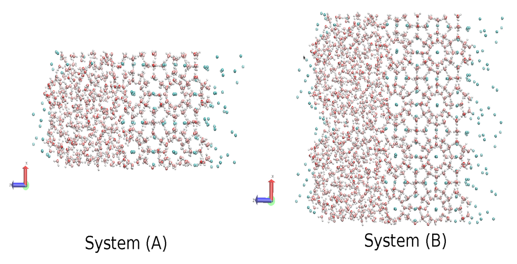 The same MD code with the direct phase coexistence method [69] was used to calculate the three-phase gas-liquid-hydrate coexistence temperature. We used the same time-step, the same thermostat and the same barostat, but allowing each of the three orthogonal directions to fluctuate independently, as described in [42]. It is worth mentioning that this procedure has been acknowledged to lead to an appropriate computational prediction of the phase diagram [70]. We made the coexistence analysis on two systems; System A comprised the same initial sI hydrate in contact with two other cubic boxes of the same size, one with 368 waters in the liquid phase to one side and another with 64 methanes in the gas phase to the other side, that yielded a computational cell of size 2.406 nm × 2.406 nm × 7.218 nm, with the contact interfaces perpendicular to the Z-axis. Additionally, System B was comprised of System A replicated 2 × 1 × 1 times; this means that the hydrate phase of System B comprised 736 water molecules and 128 methane molecules; the liquid phase comprised 736 water molecules; and the gaseous phase comprised 128 methane molecules; which yielded a computational cell of size 4.812 nm × 2.406 nm × 7.218 nm (Figure 12). To equilibrate the initial configurations with each model, a short 50-ps simulation was performed at 250 K under pressures of 80, 230 and 400 bar for System A and 230 bar for System B, which did not result in either melting or crystallization. Temperature scans were then performed at 80, 230 and at 400 bar for System A and 230 bar for System B, using the same controls and time-step for all simulations of each model. The systems were simulated at each temperature while analyzing the evolution of the potential energy as a function of time. The increase in potential energy indicated melting, whereas its decrease indicated crystallization. The equilibrium phase coexistence temperature was taken as an average of the lowest temperature at which the hydrate melted and the highest temperature at which the system froze, as in [42,48].