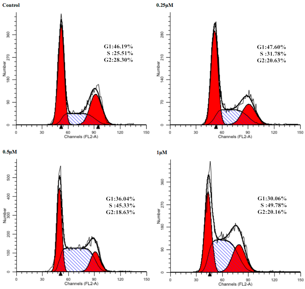 Cell cycle arrest is an important sign for inhibition of proliferation and the series of events that take place in a cell leading to its division and replication. Some NO donating hybrids exhibited cell cycle arrest properties [28]. As the inhibitory effect of 9f on cell proliferation was observed, we next assessed the effect on the cell cycle distribution of Bel-7402 cells by flow cytometry (Figure 2). Treatment of Bel-7402 cells with 9f at 0.25, 0.5 and 1 μM resulted in a remarkable increase in the percentage of cells in S/G2 phase from 25.51% of control group to 31.78%, 45.33%, and 49.78%, respectively. Compound 9f could influence Bel-7402 cell cycle progression at low micromolar concentrations in a dose-dependent manner.