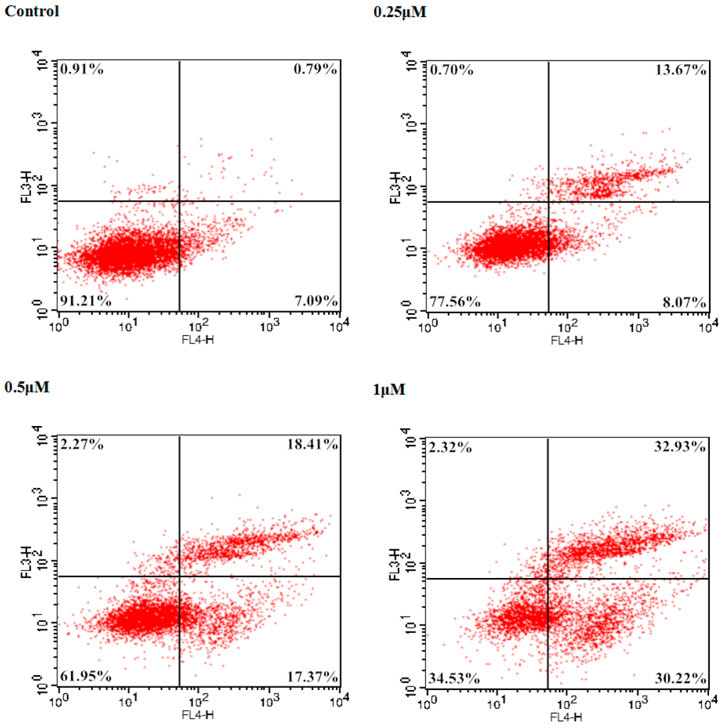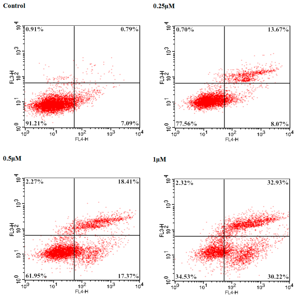 Bel-7402 cells were incubated with different concentrations (0.25, 0.5 and 1 μM) of 9f for 72 h. Then, Annexin-V and PI double staining was used to detect apoptotic cells to analyze apoptosis according to the manufacturer’s instructions by flow cytometry [35].