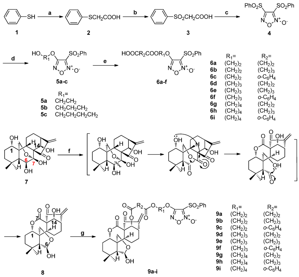 Diphenylsulfonylfuroxan (4) was obtained in a three-step sequence starting from benzenethiol (1), and was then treated with corresponding diol to afford monophenylsulfonylfuroxans (5a–c). Furoxan-based NO donors intermediate 6a–i were obtained from the condensation of 5a–c with corresponding anhydride. Enmein-type ent-kauranoid derivative 8 was synthesized from oridonin (7) by treatment with sodium periodate in water. Target NO donor/enmein-type ent-kauranoid hybrids 9a–i were designed and synthesized from 8 with 6a–i in the presence of DMAP/EDCI in DCM. Flash chromatography was used only at the last step of the synthetic route of each target compound (Scheme 1) [22,27].