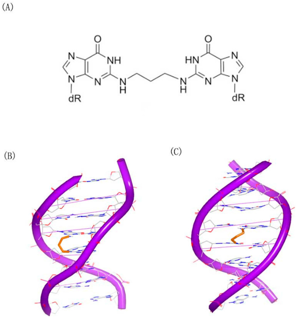 - Swenson, M.C.; Paranawithana, S.R.; Miller, P.S.; Kielkopf, C.L. Structure of a DNA repair substrate containing an alkyl interstrand cross-link at 1.65 Å resolution. Biochemistry 2007, 46, 4545–4553. [Google Scholar] [CrossRef] [PubMed]