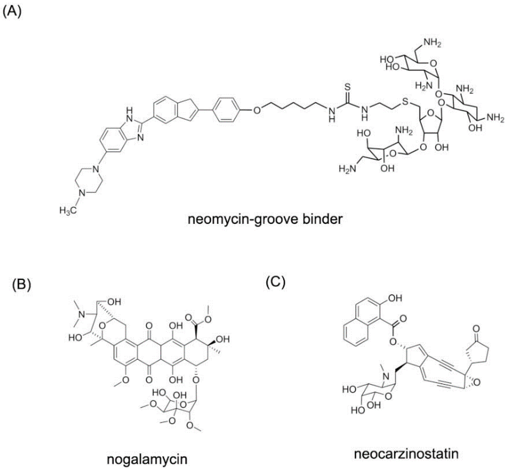 - Gao, X.; Stassinopoulos, A.; Ji, J.; Kwon, Y.; Bare, S.; Goldberg, I.H. Induced formation of a DNA bulge structure by a molecular wedge ligand-postactivated neocarzinostatin chromophore. Biochemistry 2002, 41, 5131–5143. [Google Scholar] [CrossRef] [PubMed]