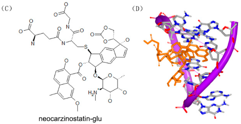 - Goldberg, I.H. Mechanism of neocarzinostatin action: Role of DNA microstructure in determination of chemistry of bistranded oxidative damage. Acc. Chem. Res. 1991, 24, 191–198. [Google Scholar] [CrossRef]