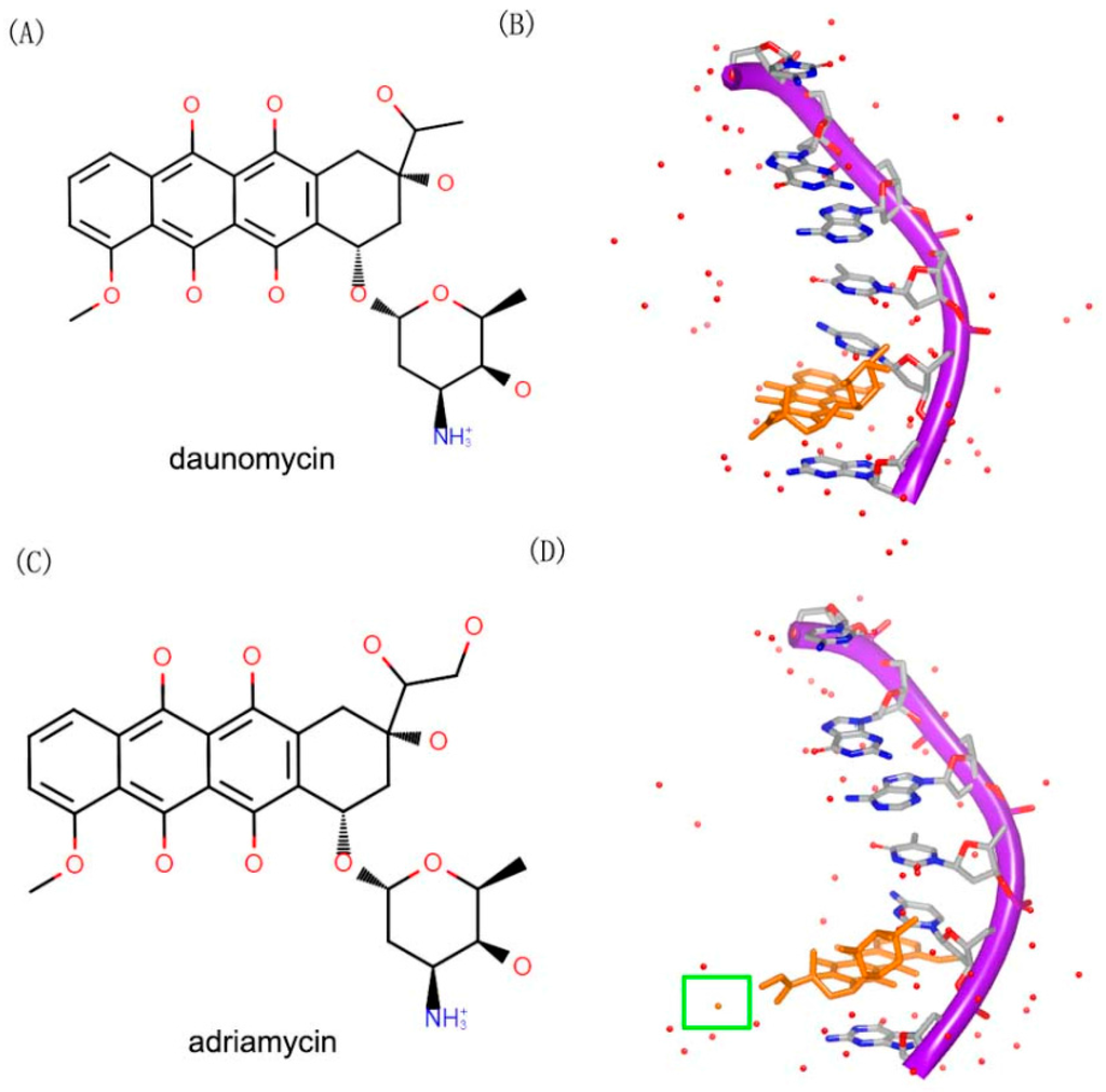 - Frederick, C.A.; Williams, L.D.; Ughetto, G.; van der Marel, G.A.; van Boom, J.H.; Rich, A.; Wang, A.H. Structural comparison of anticancer drug-DNA complexes: Adriamycin and daunomycin. Biochemistry 1990, 29, 2538–2549. [Google Scholar] [CrossRef] [PubMed]