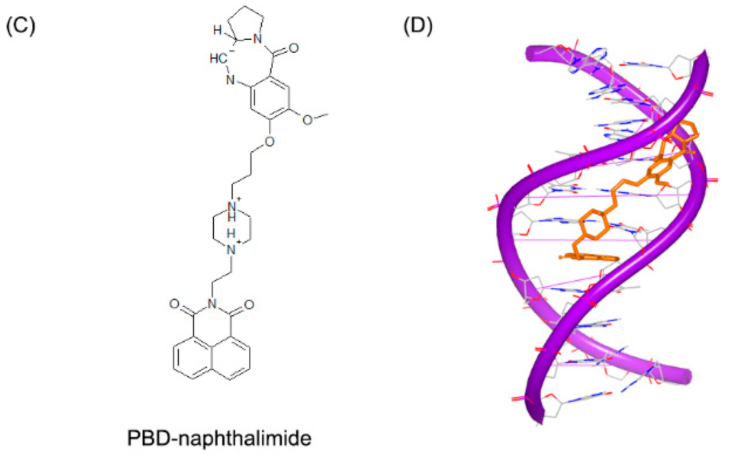 - Rettig, M.; Langel, W.; Kamal, A.; Weisz, K. NMR structural studies on the covalent DNA binding of a pyrrolobenzodiazepine-naphthalimide conjugate. Org. Biomol. Chem. 2010, 8, 3179–3187. [Google Scholar] [CrossRef] [PubMed]