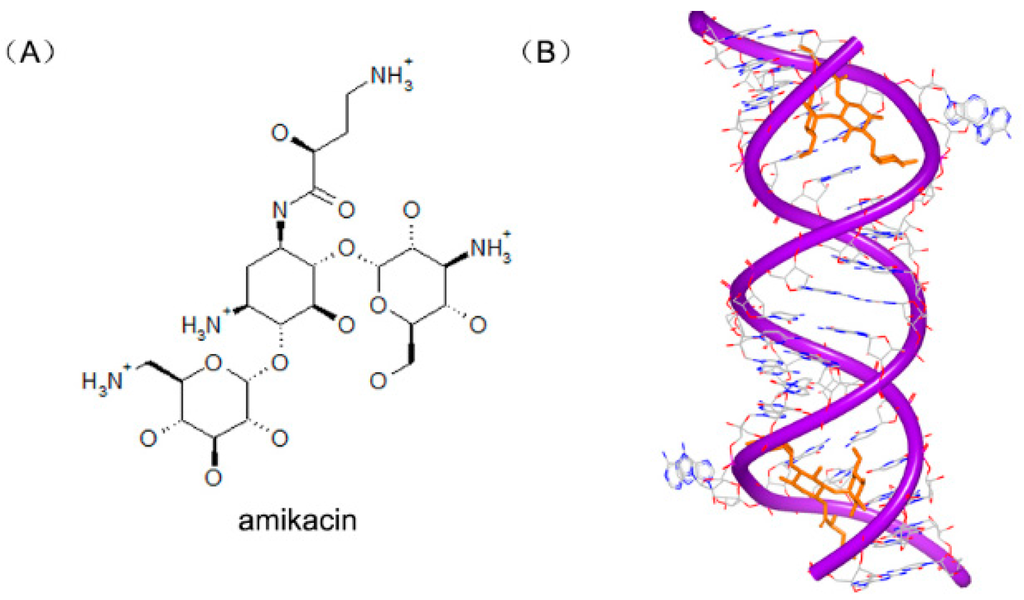 - Kondo, J.; Francois, B.; Russell, R.J.; Murray, J.B.; Westhof, E. Crystal structure of the bacterial ribosomal decoding site complexed with amikacin containing the γ-amino-α-hydroxybutyryl (haba) group. Biochimie 2006, 88, 1027–1031. [Google Scholar] [CrossRef] [PubMed]