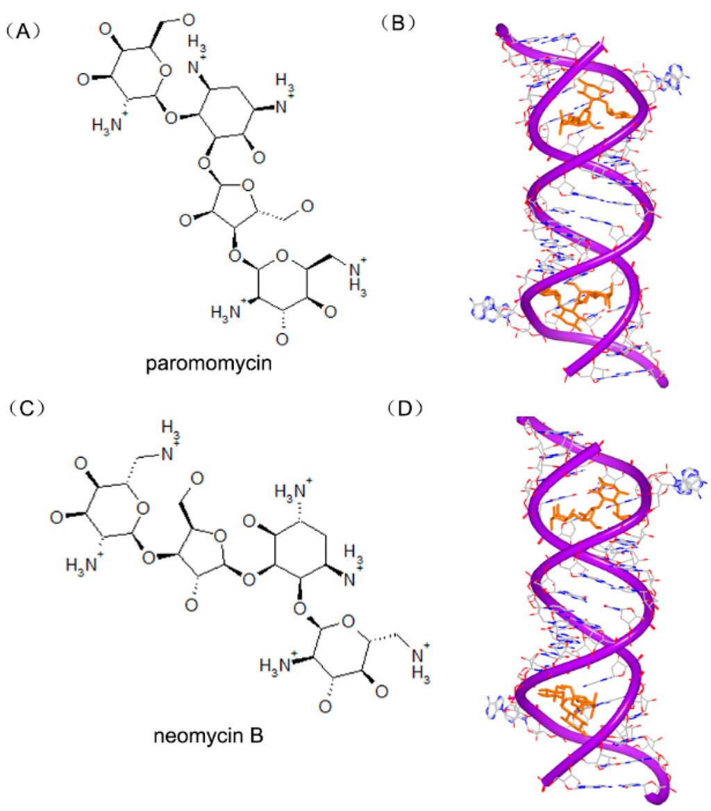 - Vicens, Q.; Westhof, E. Crystal structure of paromomycin docked into the eubacterial ribosomal decoding a site. Structure 2001, 9, 647–658. [Google Scholar] [CrossRef]