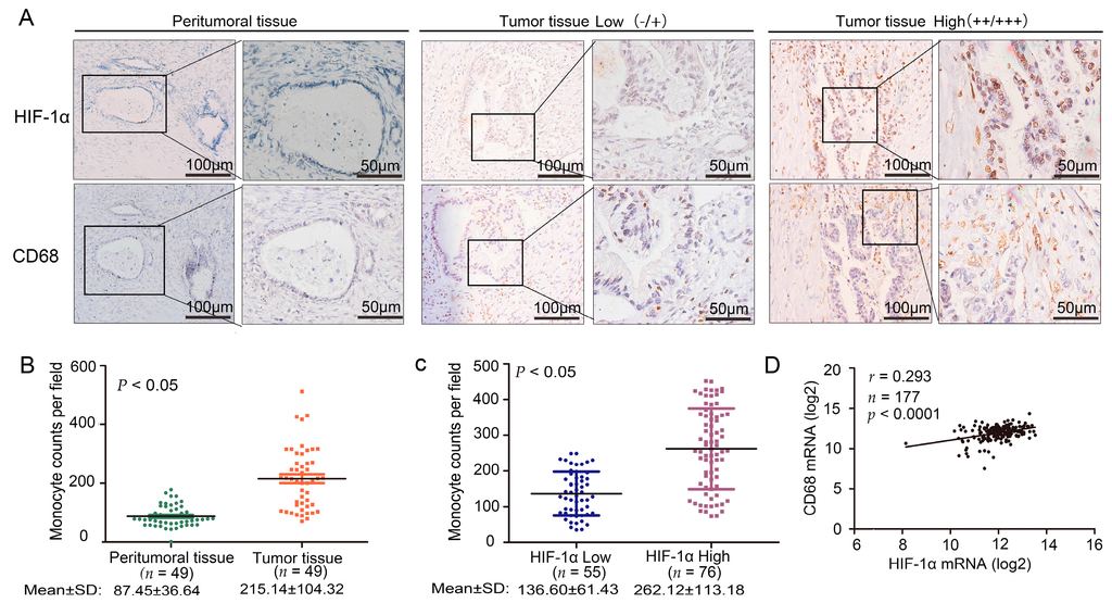 The correlation between hypoxia inducible factor (HIF)-1α and CD68 expression in specimens of pancreatic ductal adenocarcinoma (PDAC). (A) Immunohistochemical analysis of HIF-1α and CD68 correlative expression in consecutive sections from human PDAC surgical samples (tumor tissue and peritumoral tissue). Left, low expression (intensity grade − and +); Right, high expression (intensity grade ++ and +++) (magnification, 100 or 200); (B) Statistical analysis of CD68 and HIF-1α in tumor tissue and peritumoral tissue; (C) Statistical analysis of CD68 and HIF-1α in the PDAC surgical samples; (D) Analyzed messenger RNA (mRNA) expression profiles of HIF-1α and CD68 in 177 PDAC patients from The Cancer Genome Atlas (TCGA).