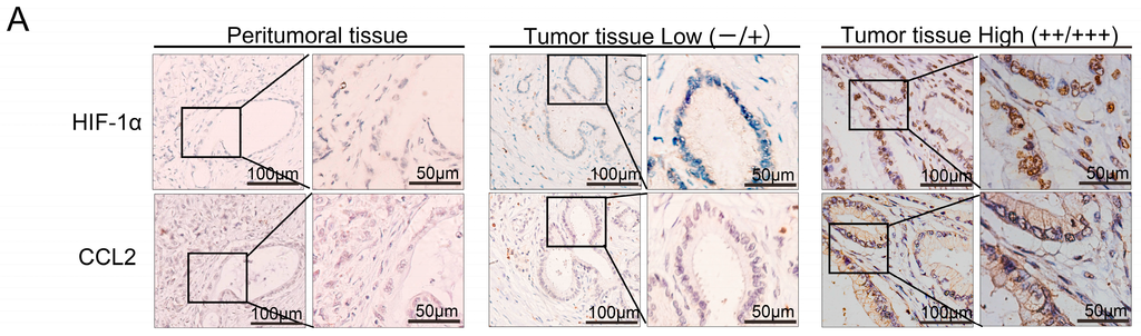 This experiment was approved by the Ethics Committee of Tianjin Medical University Cancer Hospital and Institute (Tianjin China) in 2 September 2014. The project identification code was E2014092. We collected 131 cases of PDAC from surgical specimens. IHC staining was done for HIF-1α, collagen I, CD68, and CCL2 in accordance with the manufacturers’ instructions. The staining intensity was classified as 0, 1, 2, and 3, corresponding to negative, low, medium, and high. The extent of staining was also assessed as 0, 1, 2, and 3, representing the values or range of 0%, 1%–25%, 26%–50%, and 51%–100%, respectively. The final score was the total of staining intensity and extent; each final score ranged from 0 to 9. Subsequently, the score was divided into four groups: 0, 1–2, 3–4, and 6–9, which represent the negative, low, medium, and high scores, respectively. Also, we used the symbols of −, +, ++ and+++ to form representatives of the four degrees of expression. We divided four levels of expression into two groups: low expression group (−/+) and high expression group (++/+++). All the scores were evaluated by two qualified pathological personnel.