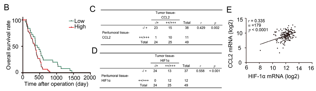 The correlation between HIF-1α and chemical chemokines 2 (CCL2) expression in specimens of PDAC. (A) Immunohistochemical analysis of HIF-1α and CCL2 correlative expression in consecutive sections from human PDAC surgical samples (tumor tissue and peritumoral tissue). Left, low expression (intensity grade − and +). Right, high expression (intensity grade ++ and +++) (magnification, 100 or 200); (B) Association between CCL2 expression levels and the overall survival of patients with PDAC. Patients with PDAC (131) were stratified into two groups according to CCL2 IHC staining intensity. Patients with high CCL2 expression (intensity grade ++ and +++) had much worse overall survival when compared with patients with low CCL2 expression (intensity grade − and +). p = 0.014 was determined with a log-rank test; (C) Statistical analysis of immunohistochemical results of CCL2 expression in tumor tissue and peritumoral tissue. p Value was calculated by the Spearman rank correlation test; (D) Statistical analysis of immunohistochemical results of HIF-1α and CCL2 expression in 131 human PDAC surgical samples. p Value was calculated by the Spearman rank correlation test; (E) Analyzed mRNA expression profiles of HIF-1α and CCL2 in 177 PDAC patients from TCGA.