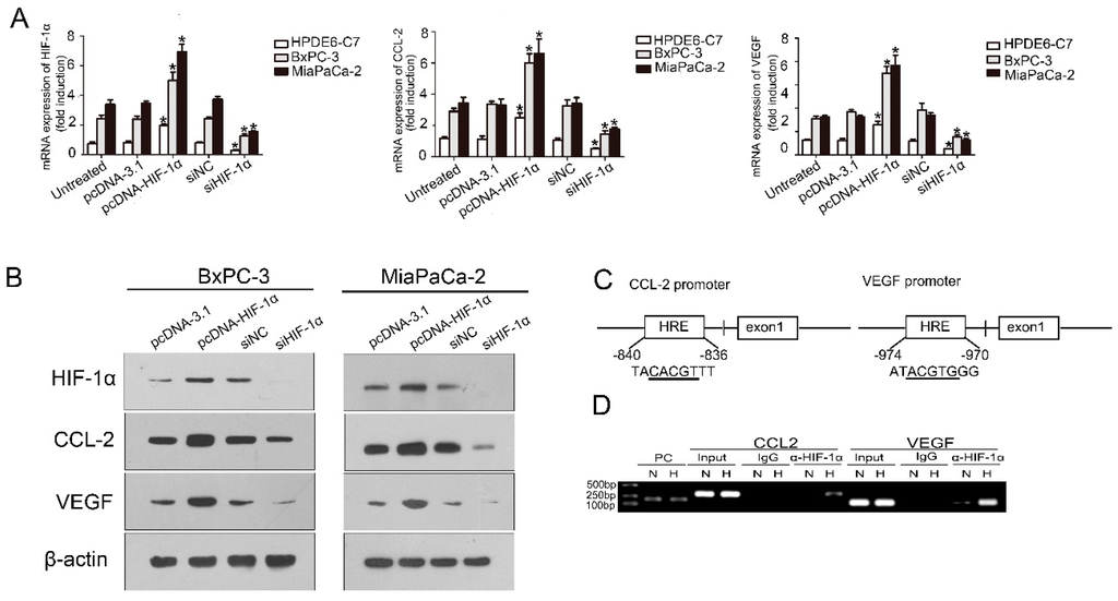 CCL2 regulates the infiltration of monocytes/macrophages and is reflected in tumor sites; in addition, HIF-1α is a critical transcriptional factor. To determine whether HIF-1α regulates the transcription of CCL2 in PDAC cell lines, we used small interfering RNAs (siRNAs) targeting HIF-1α to reduce the HIF-1α expression. The CCL2 mRNA expression on the two PDAC cell lines (BxPC-3 and MiaPaCa-2) and one normal pancreatic cell (HPDE6-C7) was detected by real-time quantitative reverse transcription polymerase chain reaction (qRT-PCR). We also found that the CCL2 expression decreased. When HIF-1α was overexpressed, the CCL2 mRNA expression markedly increased (Figure 3A). Cells without treatment and normal pancreatic cell with transfection treatment were adopted as two negative controls. We used Western-blot in the two PDAC cell lines to confirm whether HIF-1α regulates CCL2 at the protein level (Figure 3B). Semenza et al. report that hypoxia-response elements (HRE) consist of contiguous transcription factor binding sites, which contain the core sequence of 5′-A(G)CGTG-3′; HIF-1α can activate the transcription of vascular endothelial growth factor (VEGF) by the specific HRE region [,]. A chromatin immunoprecipitation assay further verified the HIF-1α has a direct regulatory effect on CCL2 (Figure 3C,D). VEGF acted as a positive control. HIF-1α was found to exert a regulatory effect on CCL2 in PDAC cell lines.