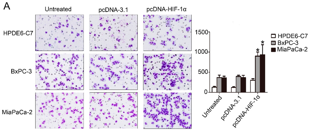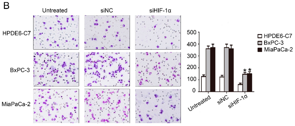 HIF-1α promoted the recruitment of macrophages. (A) A comparison of the ability of recruiting macrophages by HPDE6-C7, BxPC3, and MiaPaCa-2 cells transfected with pcDNA3.1 and pcDNA3.1-HIF-1α plasmids (4 µg) for 48 h using Boyden chambers. The experiments were performed thrice independently. * p < 0.05 vs. control (magnification, 100×); (B) A comparison of the ability of recruiting macrophages by HPDE6-C7, BxPC3, and MiaPaCa-2 cells transfected with negative control siRNA and HIF-1α siRNA (50 nmol/L) for 48 h using Boyden chambers. The experiments were performed thrice independently. * p < 0.05 vs. control (magnification, 100×).