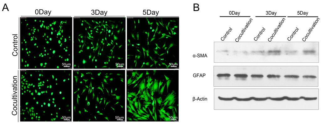 Macrophages promoted the activation of PSCs. (A) PSCs in co-cultured group were more active than those in the control group; (B) Western-blot analysis verified that the expression of α-smooth muscle actin (α-SMA) in PSCs was significantly higher than that in the control group; in addition, glial fibrillary acidic protein (GFAP) did not change significantly, and β-actin was used as a reference; (C) An immunofluorescence assay confirmed that the main changes in PSCs were ascribed to the disappearance of lipid droplets and the increased expression of α-SMA.