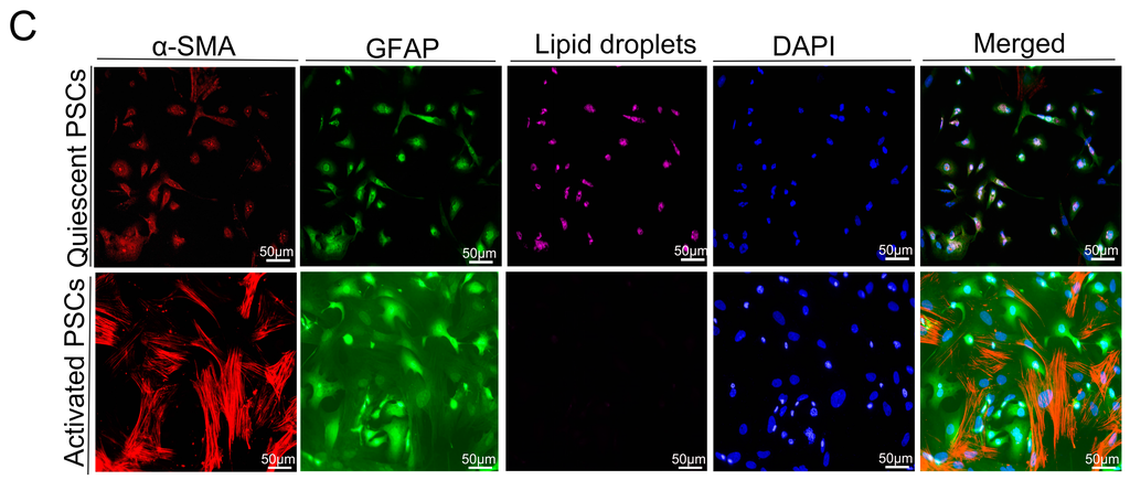 Freshly isolated PSCs were cultured on the glasses at the appropriate time the medium was drained. The PSCs were washed twice with PBS, fixed with 4% paraformaldehyde for 10 min, permeabilized with 0.1% Triton X-100 in PBS for 10 min, and then blocked for 1 h with 3% BSA in PBS. Subsequently, the cells were incubated with the antibodies α-smooth muscle actin (α-SMA) and GFAP, and DAPI was utilized to stain the nuclei. Finally, the cells were observed under a fluorescence microscope. For the lipid droplets of PSC staining, we used Nile red staining (Cell neutral lipid of Nile Red Staining Kit, GENMED, Shanghai, China). Before the start of the experiment, we took the Reagent A out of the kit, and then removed the PBS owned 2 mL buffer to the 2 mL centrifuge tube. We added 10 µL Reagent A, fully mixed it, and marked it as the working fluid. We placed it at 37 °C to avoid light incubation of cells for 10 min. At last, fluorescence cells were observed under the fluorescence microscope, and the excitation wavelength was 543 nm.