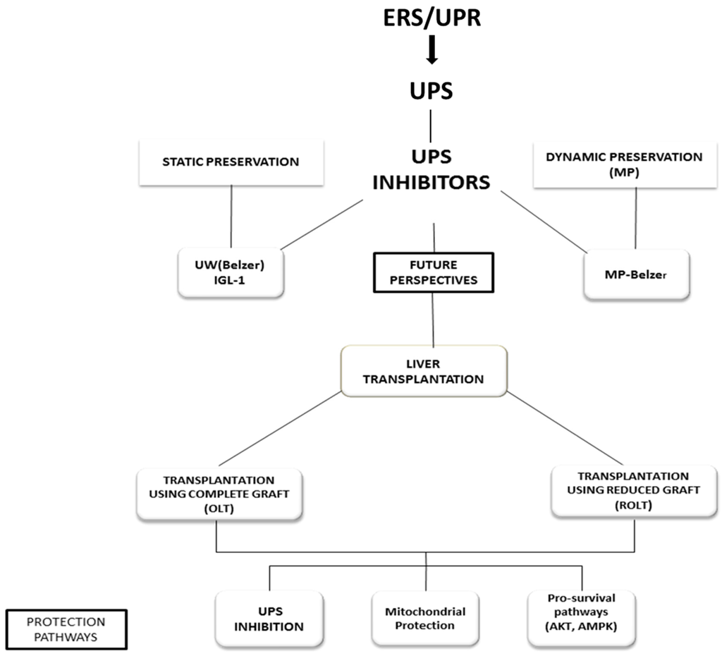 In summary, the involvement of UPR/ERS in solid organ transplantation is probably underestimated. Modulation of these processes is crucial for preventing the cold IRI associated with liver transplantation when using either complete or reduced grafts. The use and development of proteasome inhibitors for future therapeutic applications in clinical transplantation need to be explored further, placing special emphasis on their potential use as additives in static preservation and MP solutions. UPS inhibitors and other compounds with potency to ameliorate ERS may also be a useful tool for recovering some of the fatty livers for transplantation, which are currently discarded, thus increasing the number of transplantable organs for patients on waiting lists.