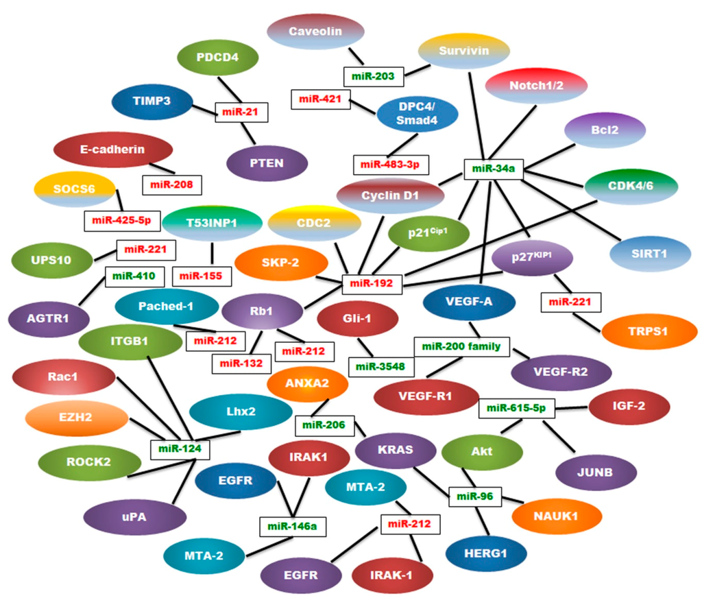 | miR-200 Family | Tumor Suppressor | Down | 1p36, 12p12 | VEGF-A, FLT1/VEGFR1 KDR/VEGFR2 | [48,49,50,51,52,53,54] |