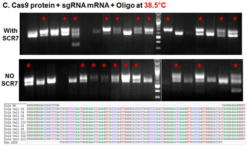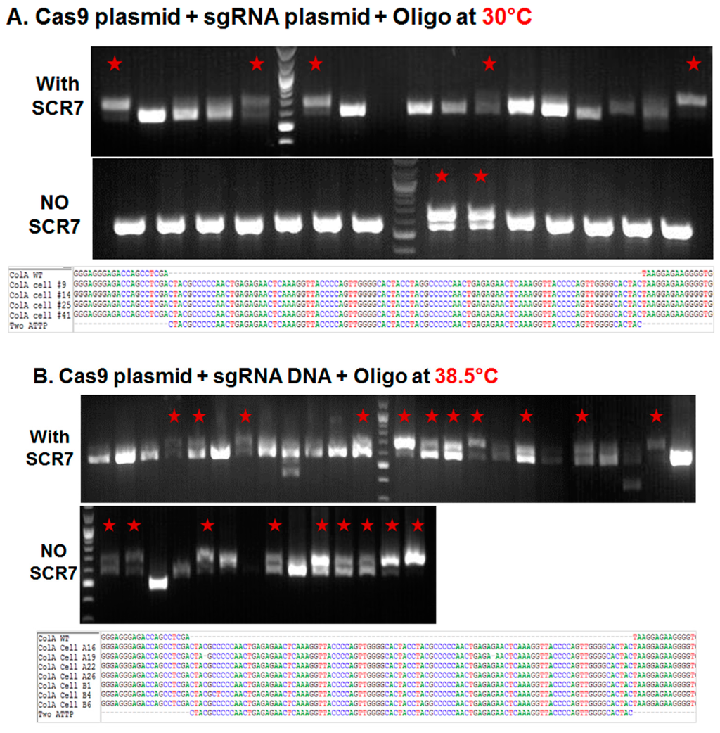 Targeted knockin of two pseudo attP sites (100 bp) downstream of the porcine COL1A locus. (A–C) Agarose gel electrophoresis analysis of amplicons generated by primers bordering the COL1A targeting site. PCR amplicons of representative colonies derived from plasmid transfection and transient incubation at 30 °C (A) or 38.5 °C (B); and ribonucleoprotein (C) transfection and culture at 38.5 °C. In each panel, representative colonies showing a new band with predicted shift of 100 bp on the agarose gel produced by successful targeting and introgression of the two pseudo attP sites is marked by a red star. In each panel, the top row represents knockin in the presence of SCR7, the middle row without SCR7 and the bottom row represents Sanger sequencing of the amplicon. Multiple sequence alignment of wild type (WT) COL1A gene and two pseudo attP knockin sites are shown. Each nucleotide is color coded.