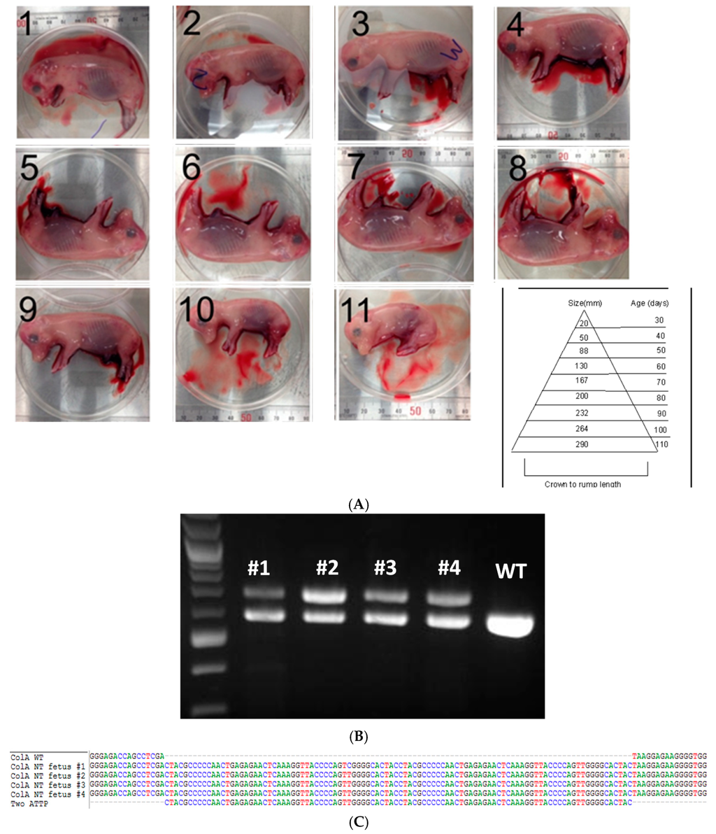 2.2. Somatic Cell Nuclear Transfer to Generate Clonal COL1A Targeted Fetuses and Fibroblast Lines